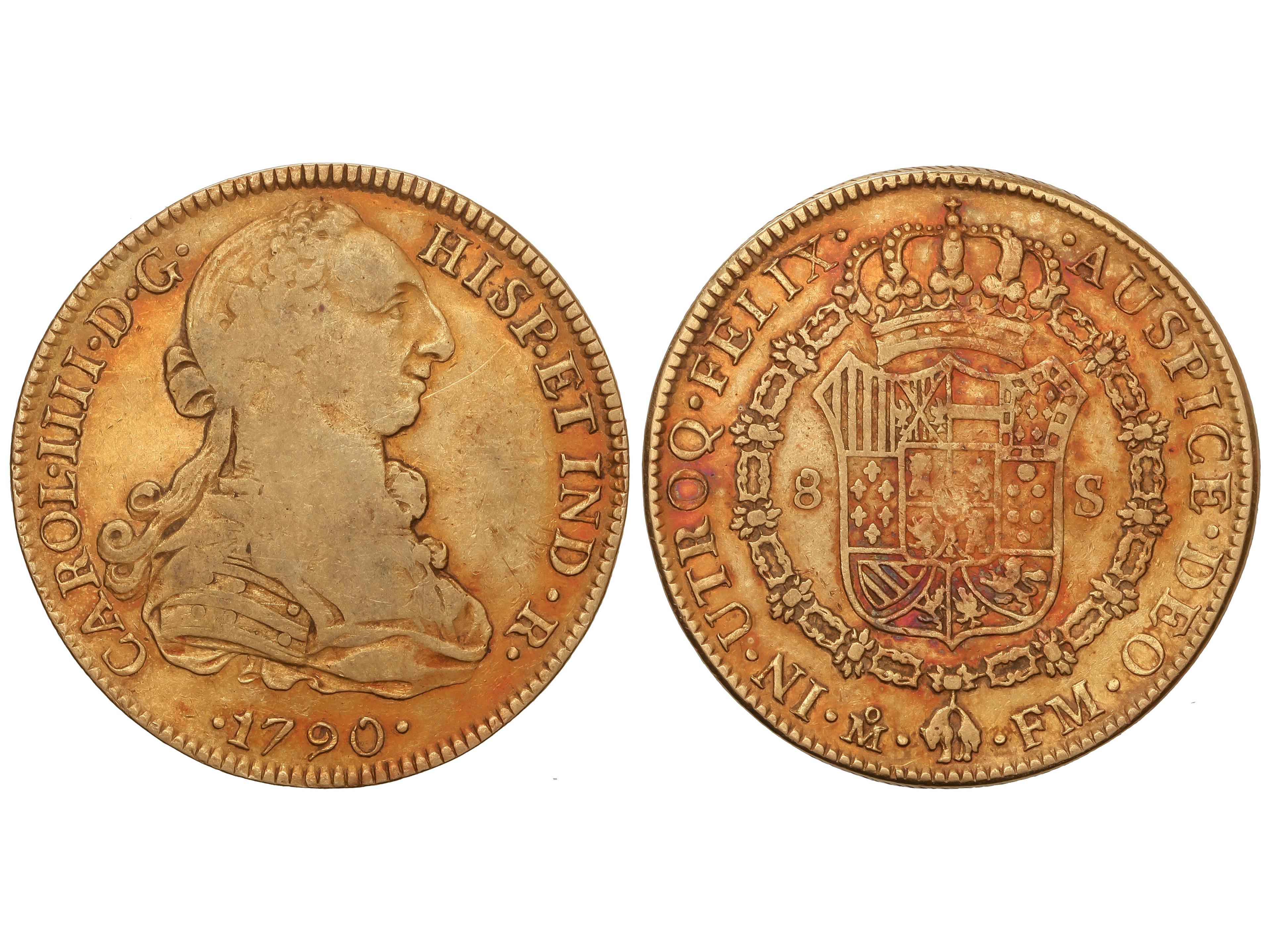 Escudos. 1790. MÉXICO. F.M. 26,76 grs. Busto de Carlos III, ordinal IIII. (Pequeñas rayitas y golpecitos). Pátina irisada irregular. AC-1629; XC-1017. MBC-. (Image1)