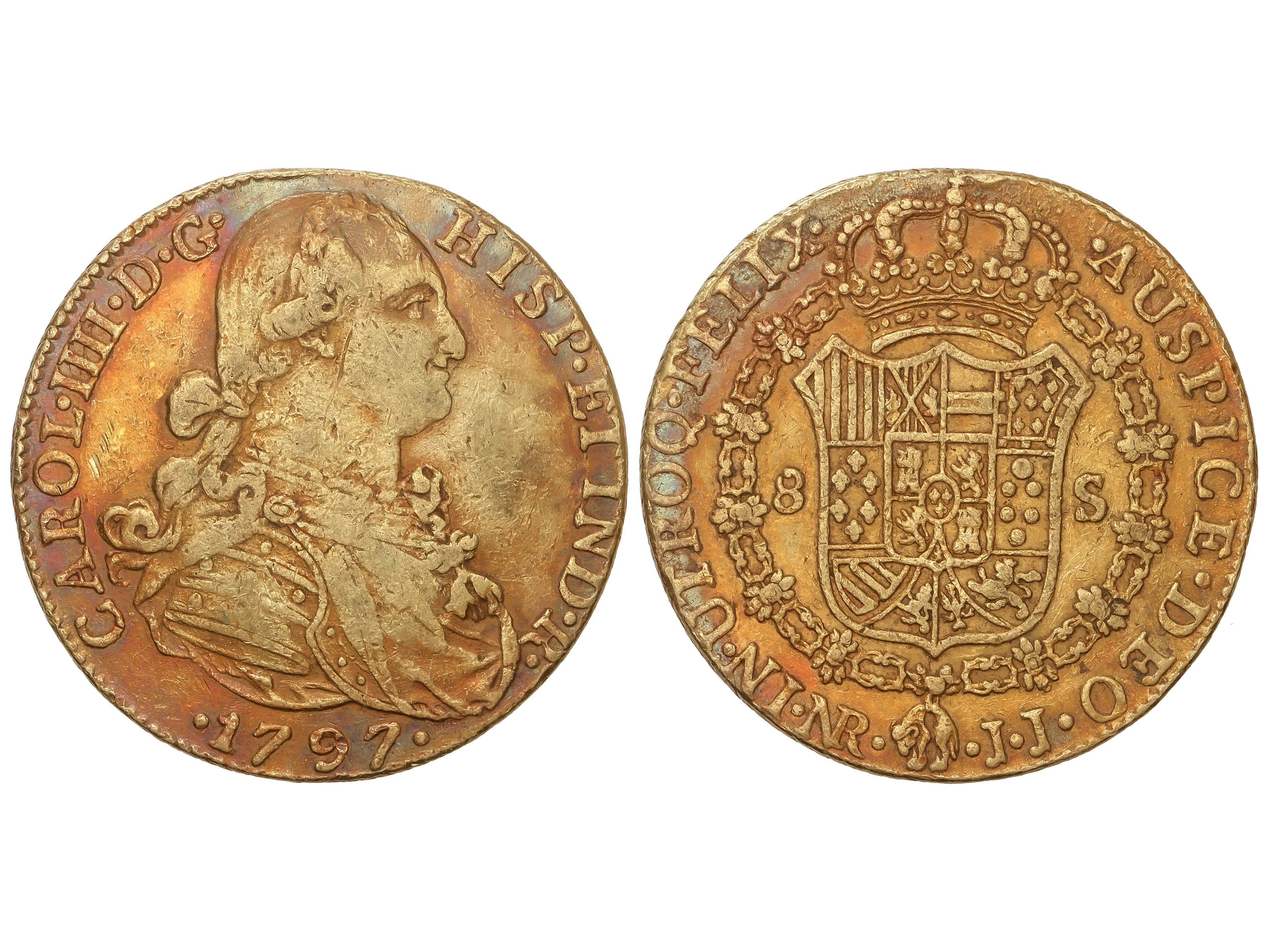 Escudos. 1797. NUEVO REINO. J.J. 26,84 grs. Sin punto delante de CAROL. (Descolgada). Pátina irisada irregular. AC-1730; XC-1129. MBC-.