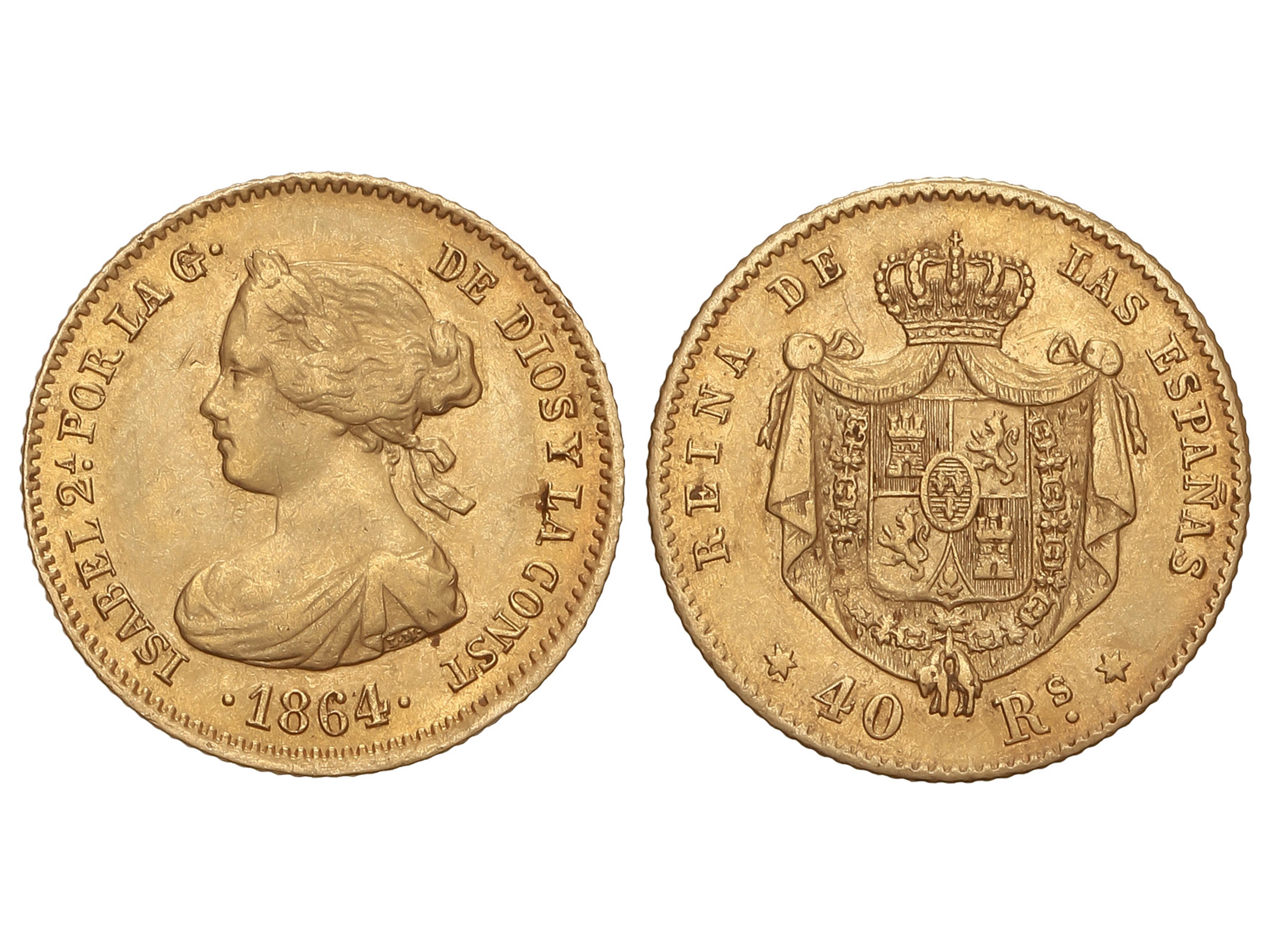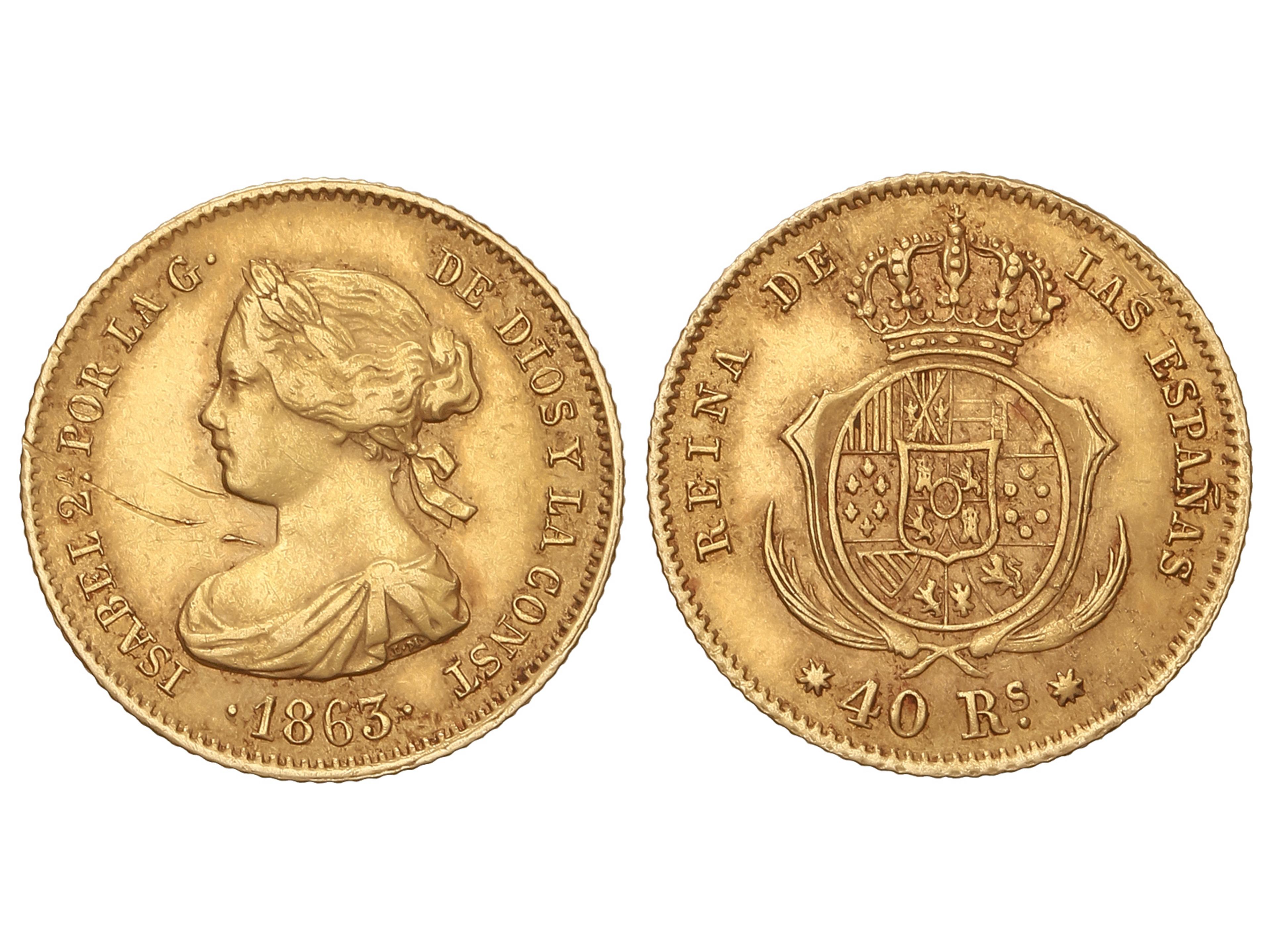 40 Reales. 1863. BARCELONA. 3,36 grs. (Rayas en anverso). AC-677. MBC+. Ex Áureo & Calicó 278 - 25 mayo 2016, n. 2980.
