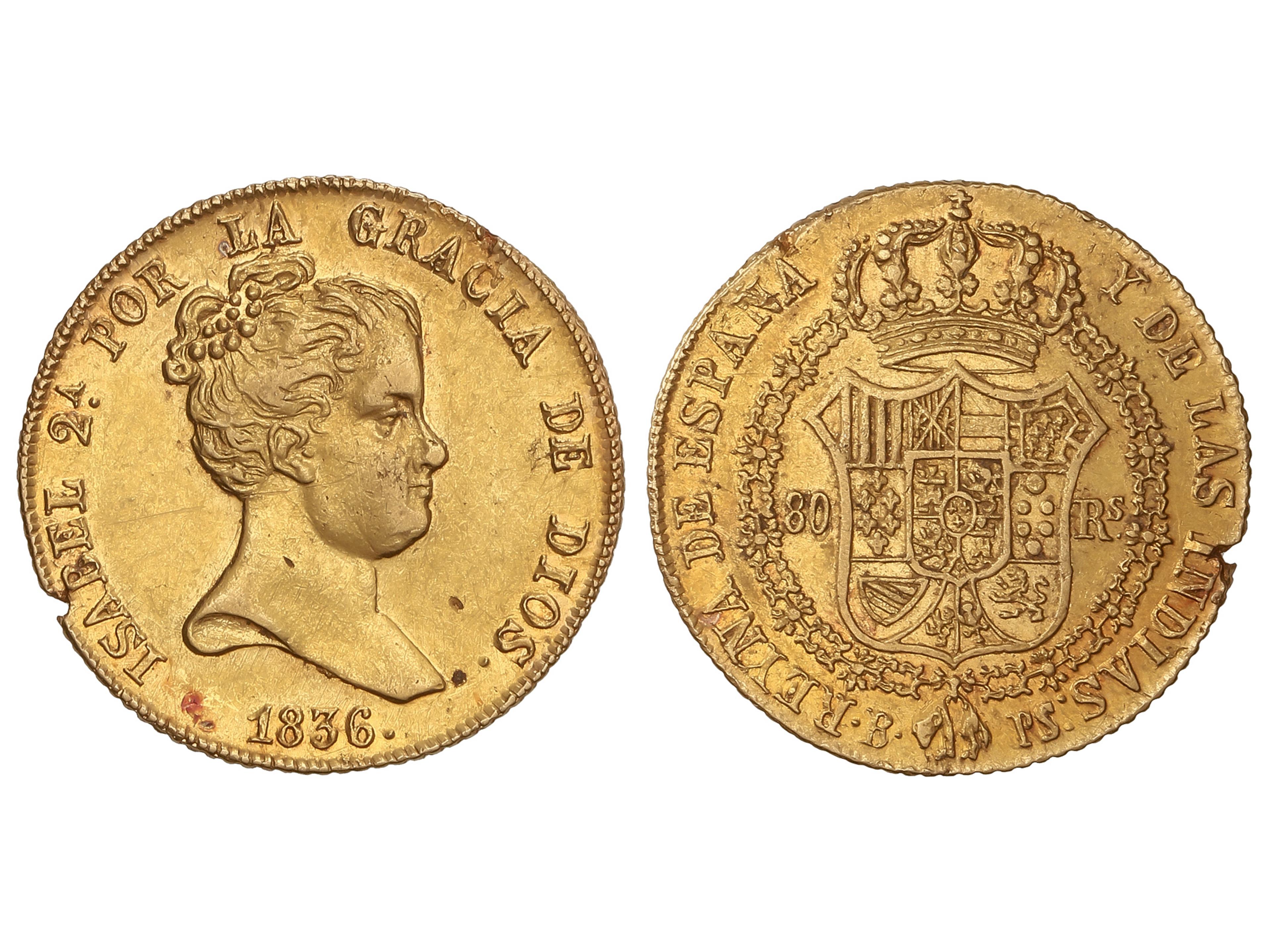 80 Reales. 1836. BARCELONA. P.S. 6,69 grs. Final de leyenda DIOS. (Leves grietas en canto y rayitas). Restos de brillo original. RARA. AC-699. MBC+. (Image1)