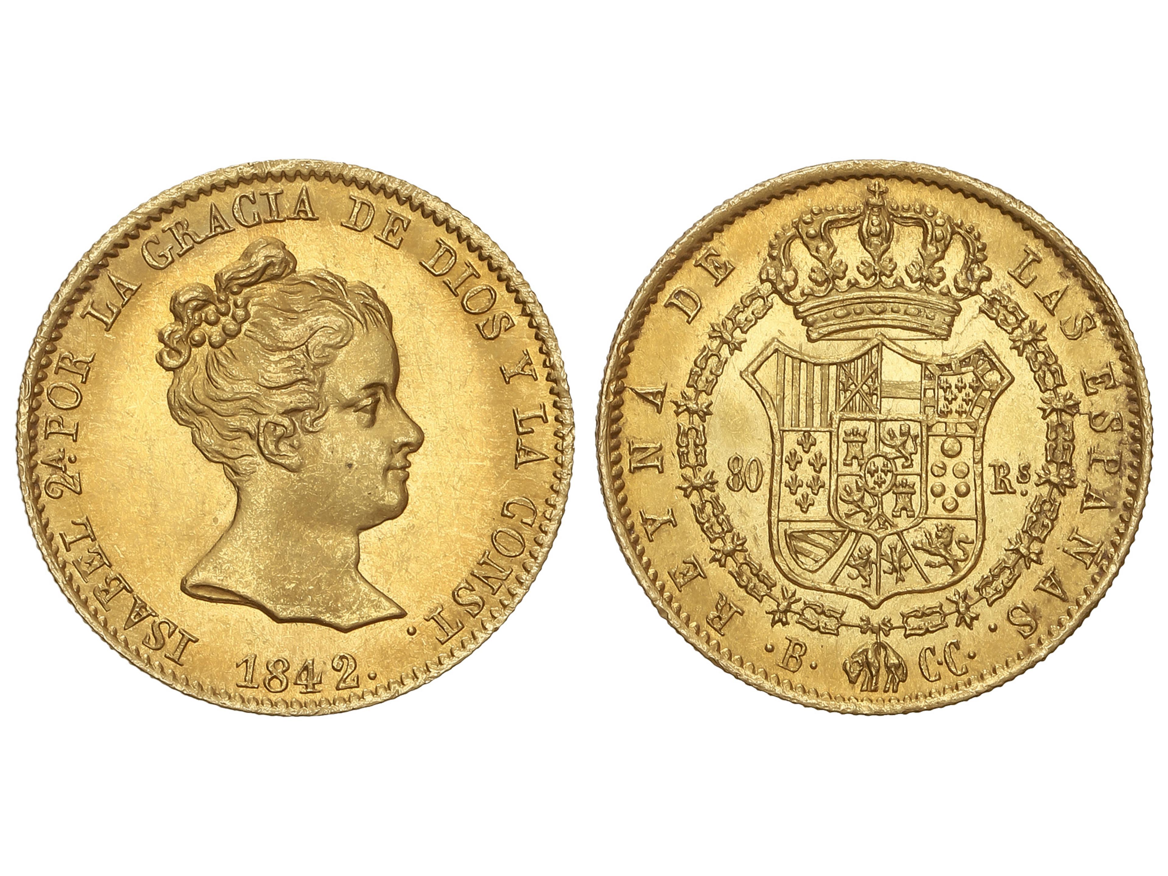80 Reales. 1842. BARCELONA. C.C. 6,75 grs. (Ínfimas rayitas). Brillo original. ESCASA ASÍ. AC-709. EBC/EBC+.