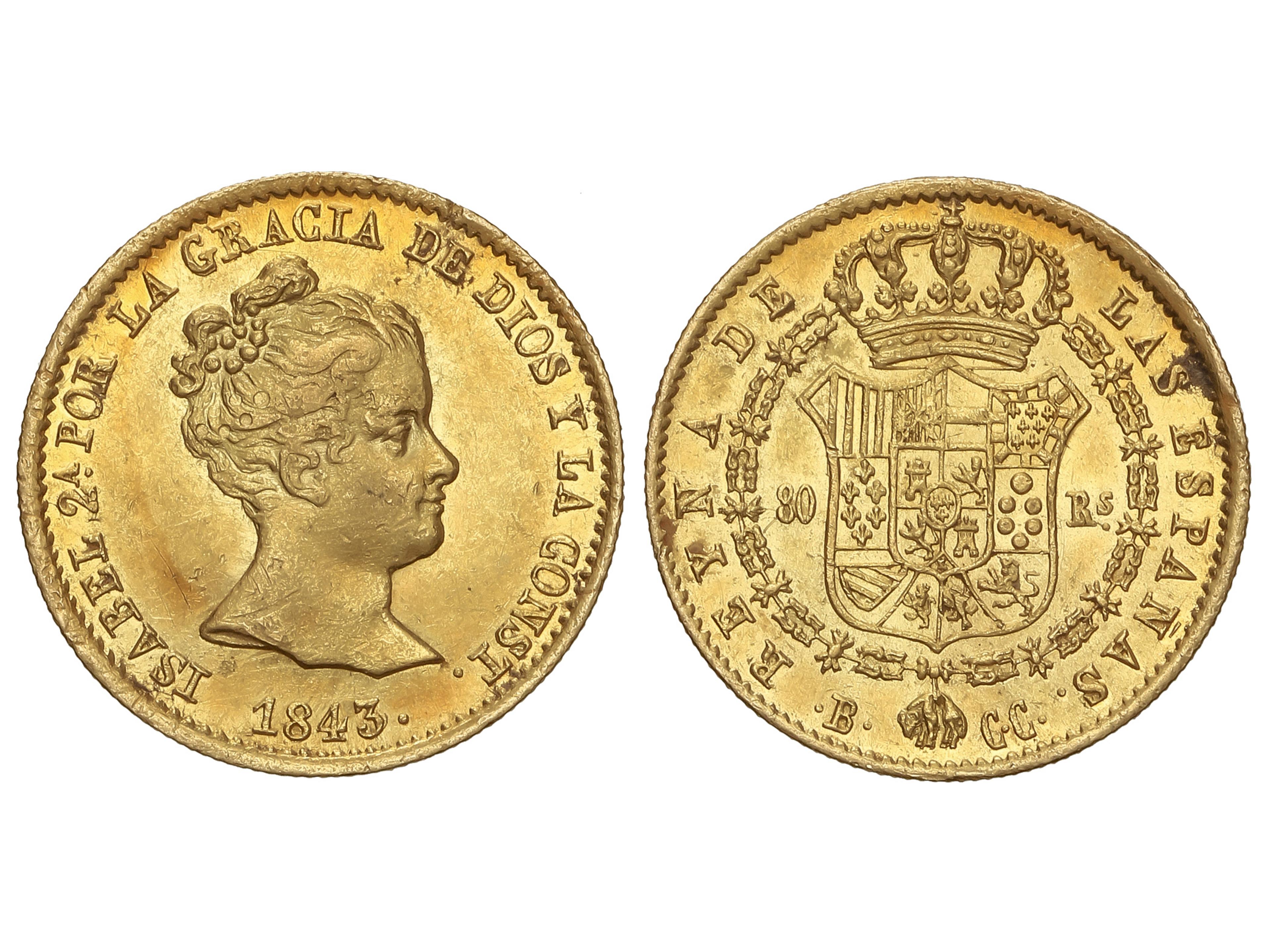 80 Reales. 1843. BARCELONA. C.C. 6,73 grs. (Leves golpecitos). Brillo original. AC-710. (EBC-)/EBC. (Image1)