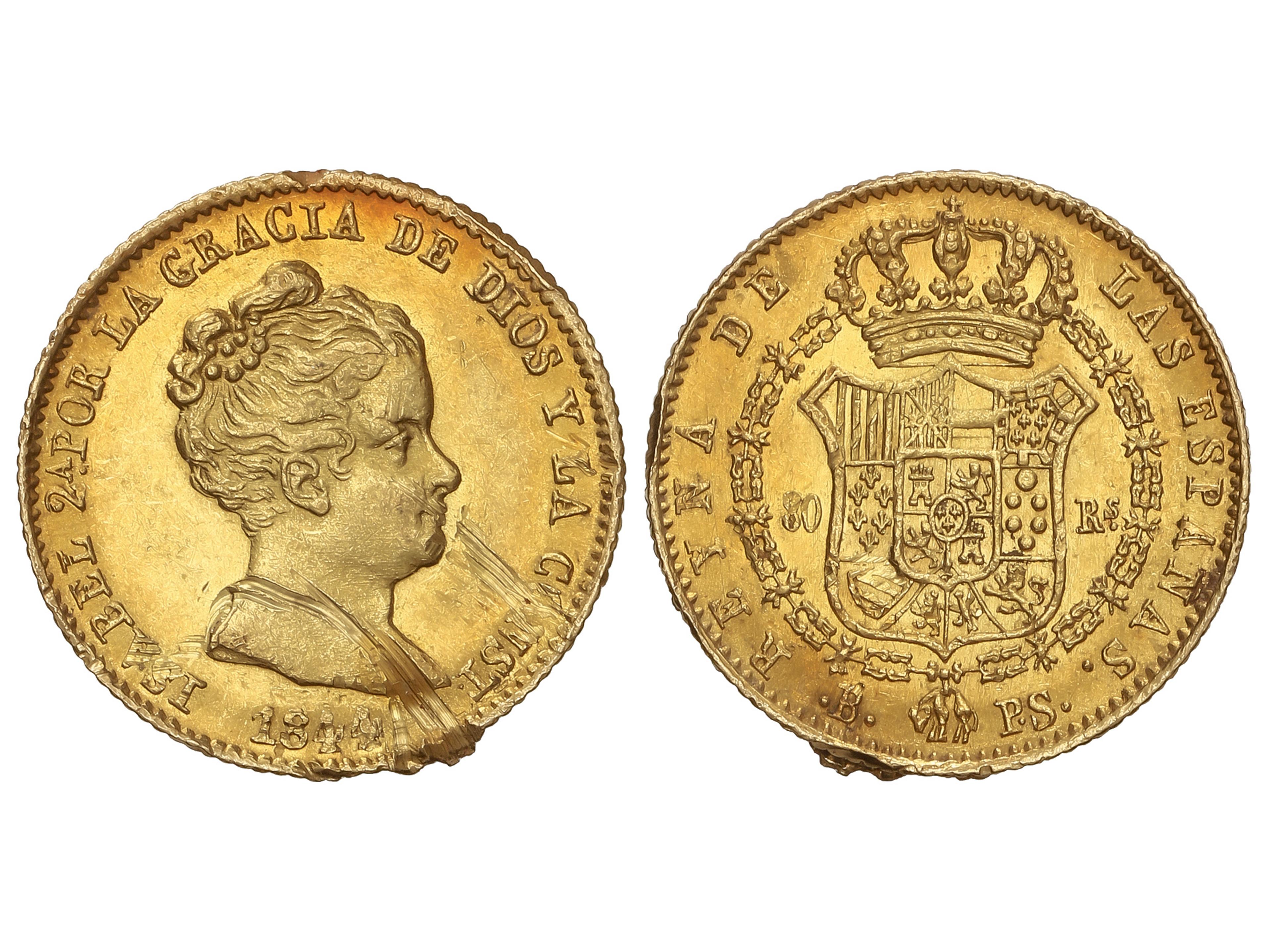 80 Reales. 1844. BARCELONA. P.S. 6,74 grs. (Rayas y golpes, algunos en canto). Brillo original. AC-711. EBC-.
