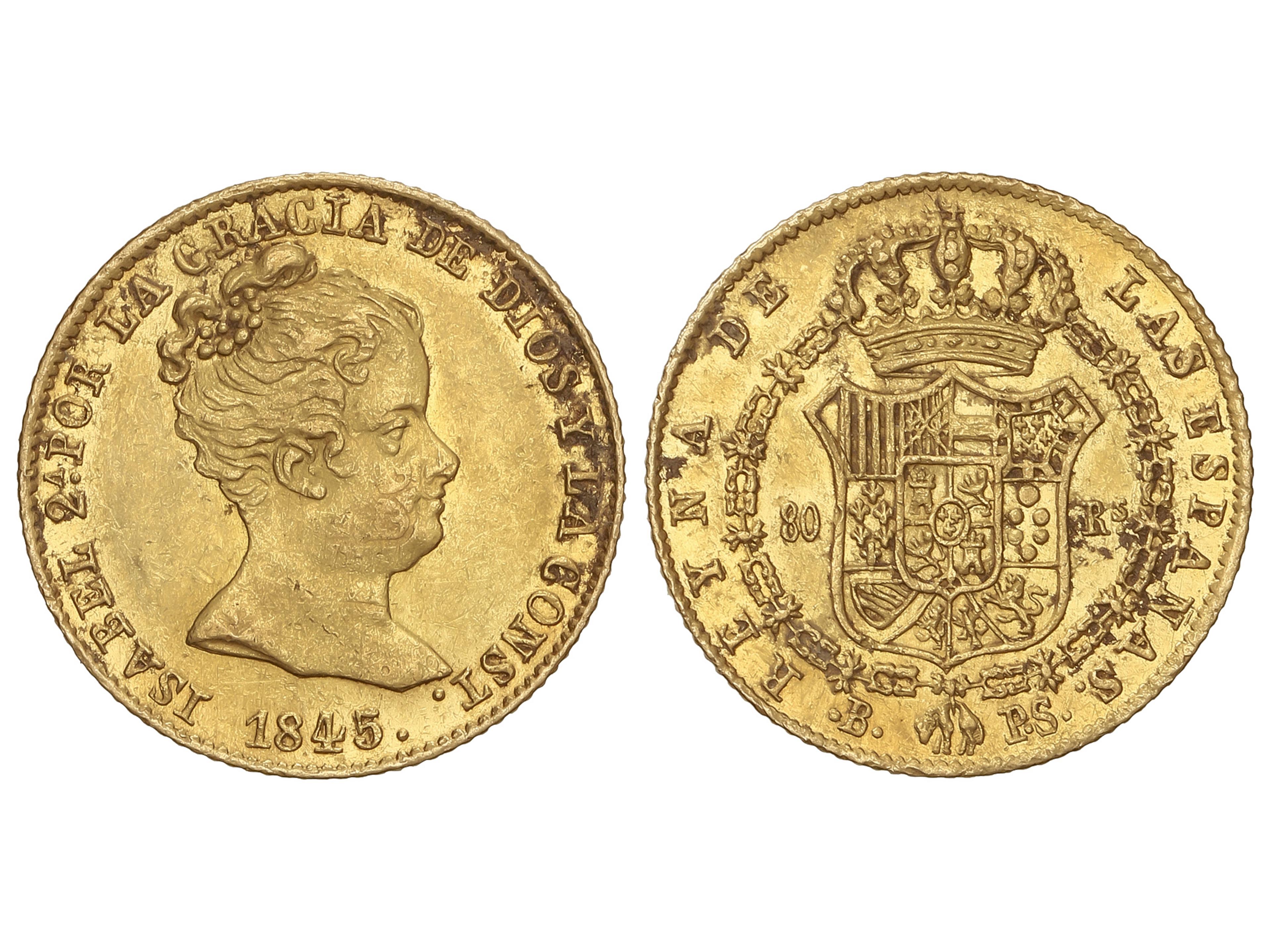 80 Reales. 1845. BARCELONA. P.S. 6,75 grs. (Leves concreciones). Restos de brillo original. AC-713. EBC-. (Image1)
