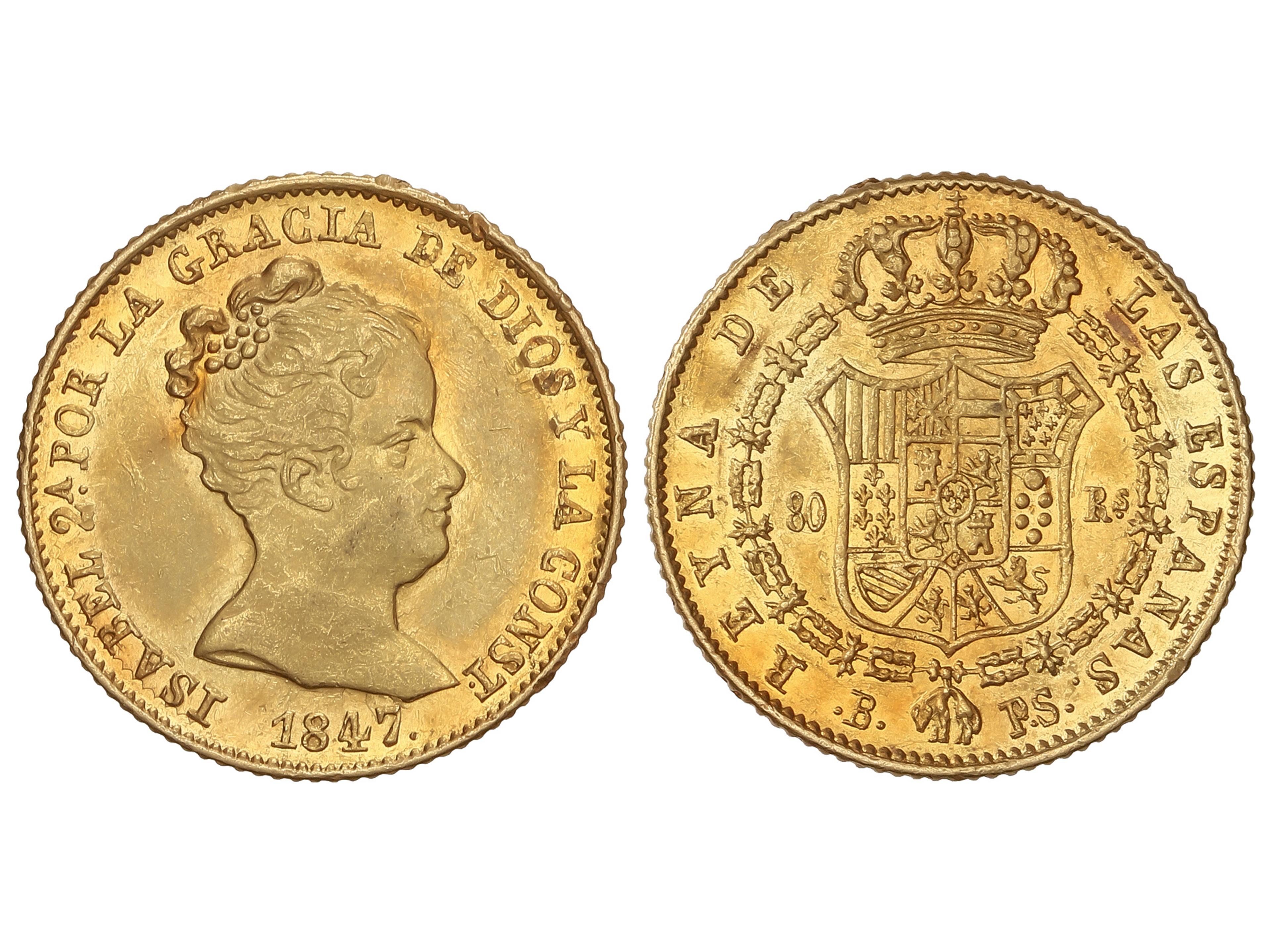 80 Reales. 1847. BARCELONA. P.S. 6,72 grs. (Pequeños golpecitos, algunos en canto). Brillo original. AC-716. EBC-/EBC+.