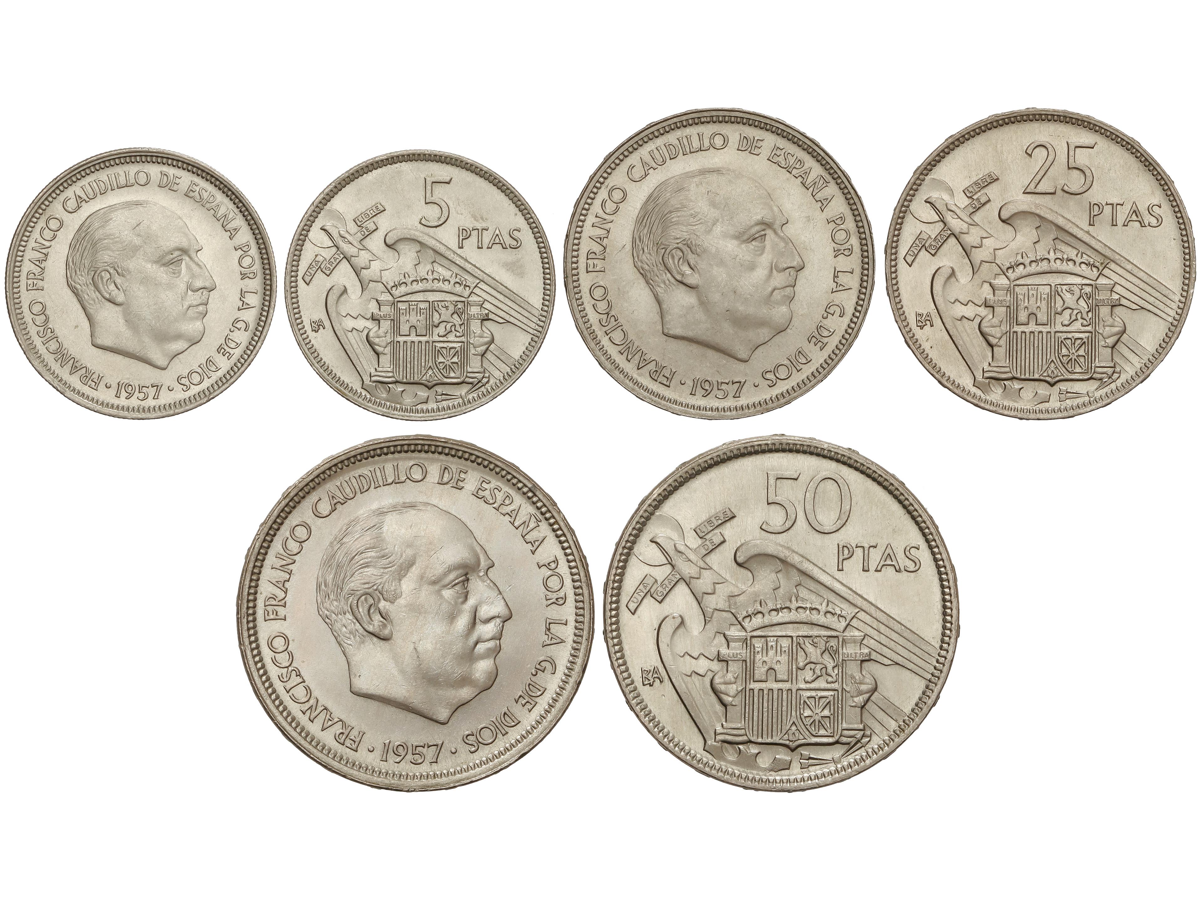 680 imageSerie 3 monedas 5, 25 y 50 Pesetas. 1957 (*BA). I Exposición Iberoamericana de Numismática y Medallística. Barcelona. EBC+. (Image1)
