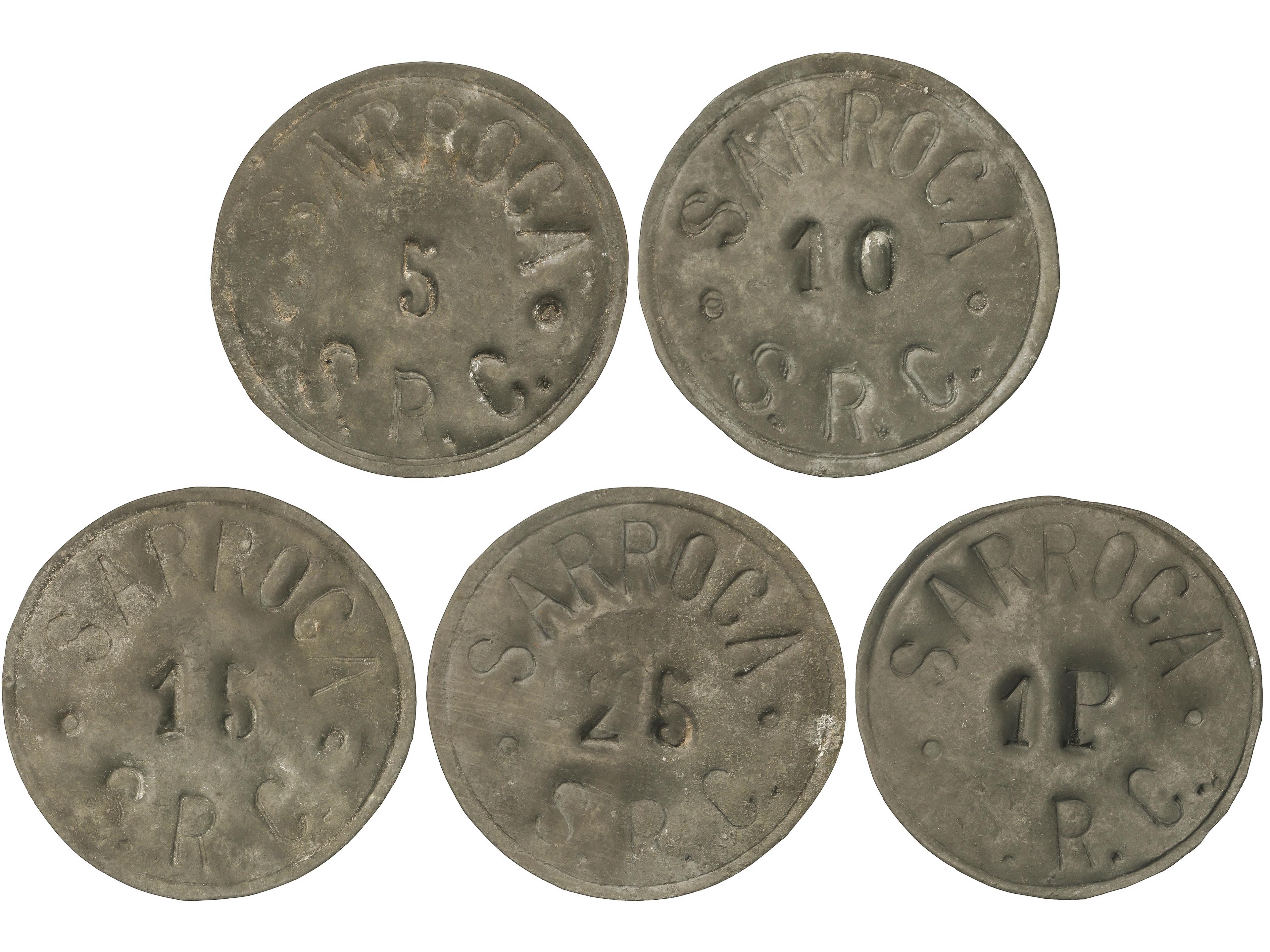 668 imageSerie 5 monedas 5, 10, 15 y 25 Cèntims y 1 Pesseta. SARROCA. Sindicat Rural Cooperatiu. Zinc. RARAS. T-2656, 2660/63; Vti-L35/38 y 40. MBC a MBC+. (Image1)