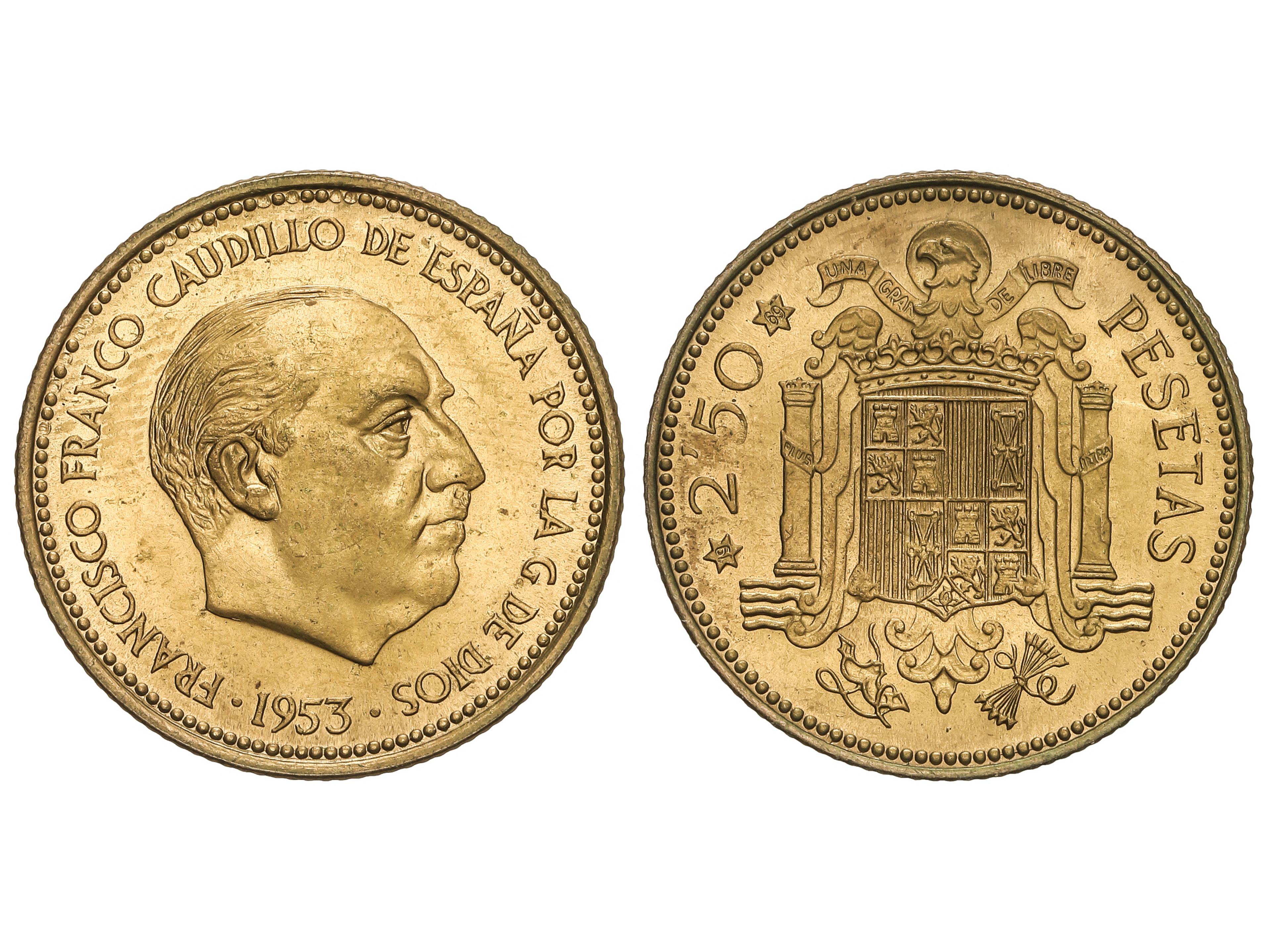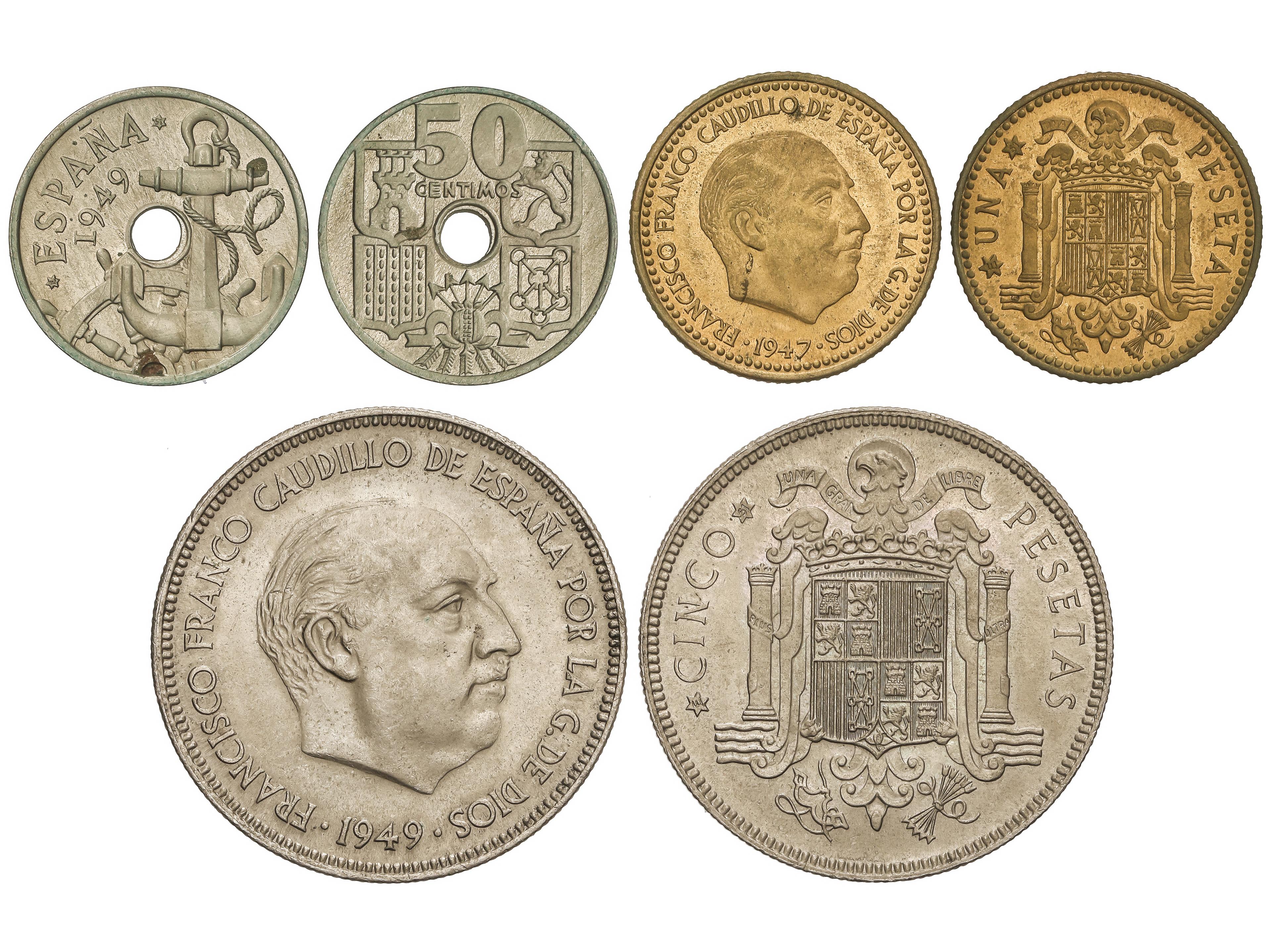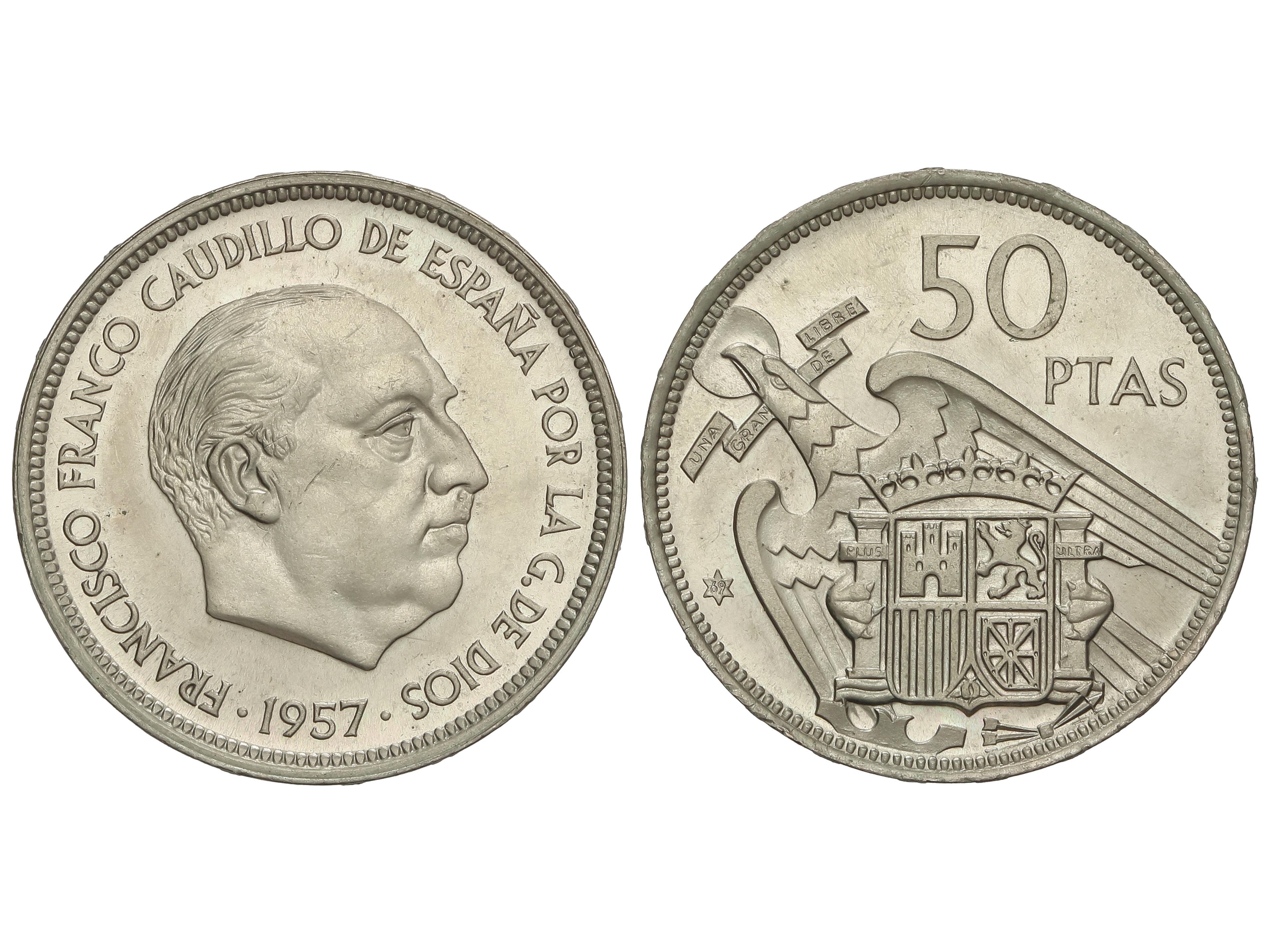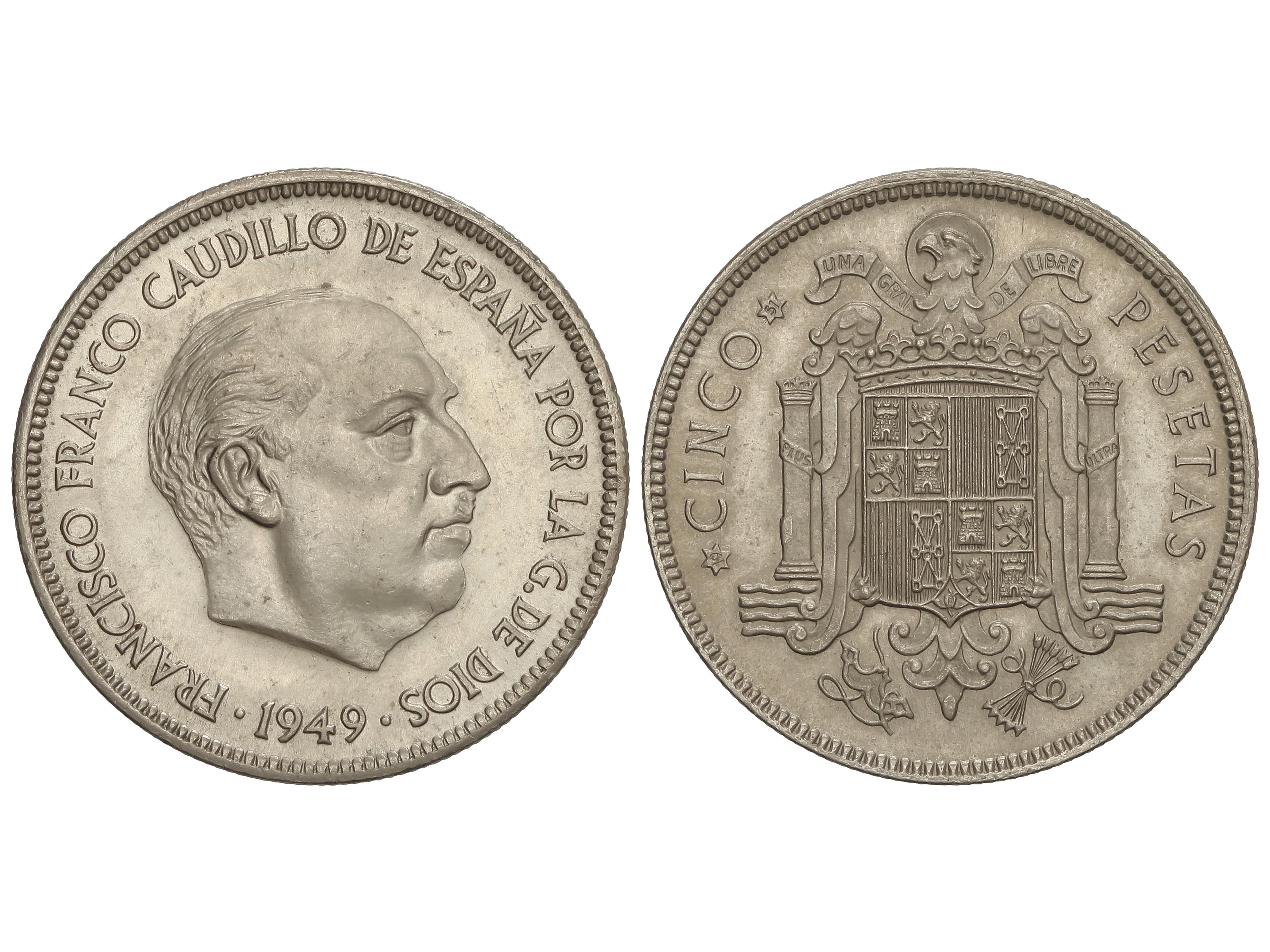 676 image5 Pesetas. 1949 (*19-51). Debido al incremento del precio de coste del níquel en 1951, el valor del metal que contenían estas piezas superaba las 5 Pesetas. Esto produjo su retirada del mercado. Todas las monedas depositadas en la Casa de la Moneda fueron fundidas a excepción de unas pocas como la que nos ocupa. MUY RARA. SC. (Image1)