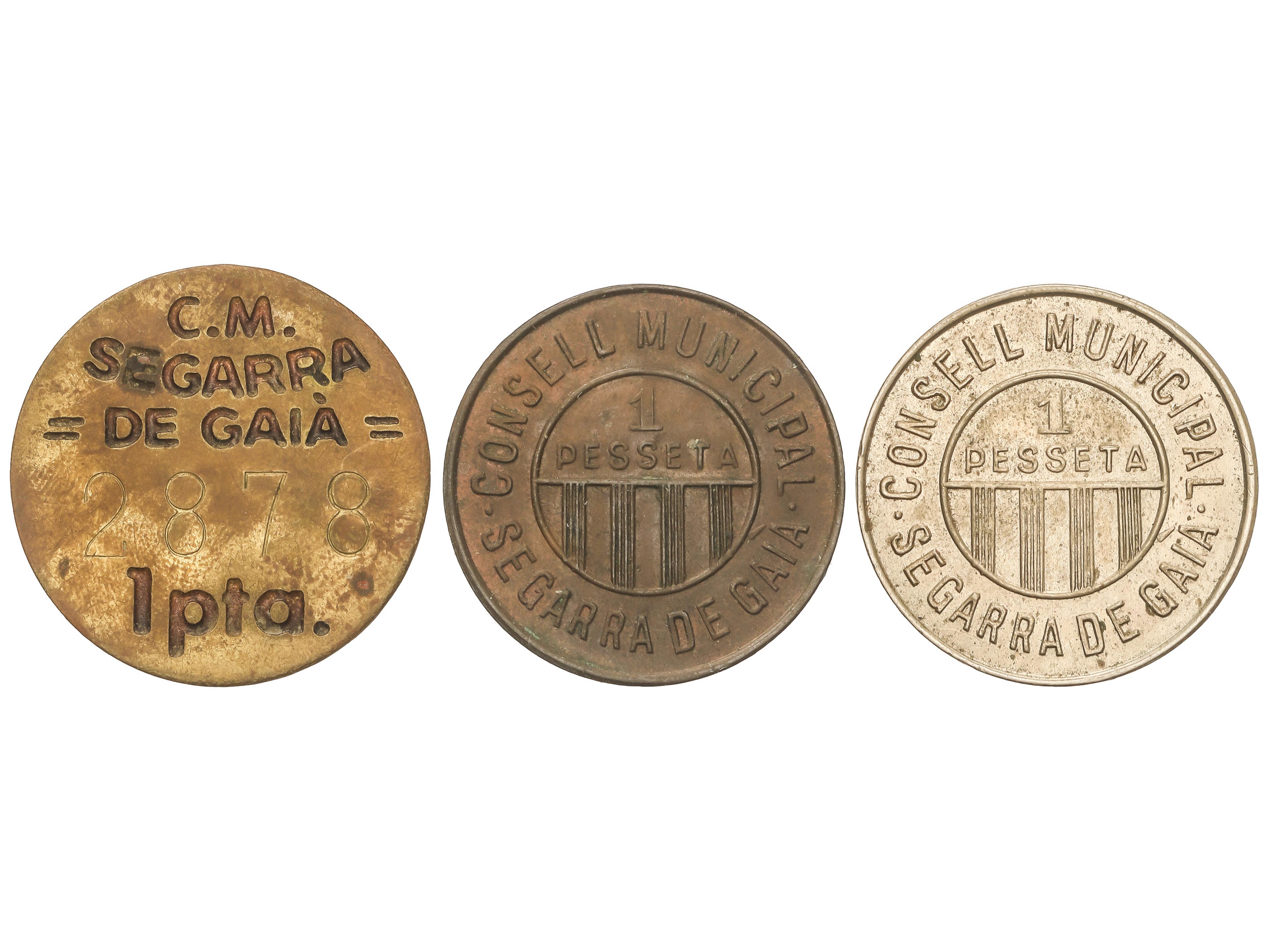 669 imageSerie 3 monedas 1 Pesseta. C.M. de SEGARRA DE GAIÀ. AE,CuNi y Latón. Serie completa. AC-36, 37, 39; HG-227/9. MBC+ a EBC. (Image1)