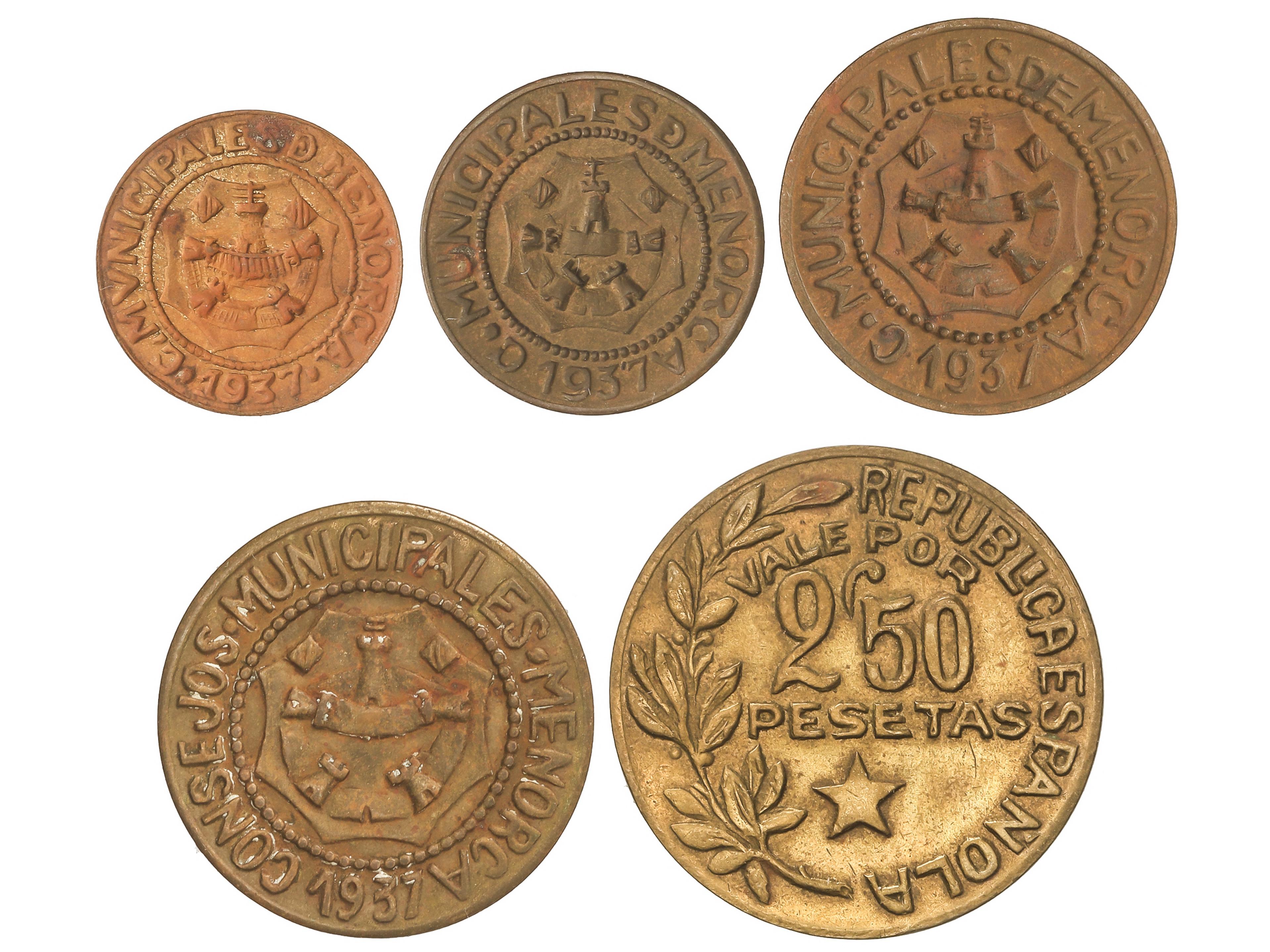 666 imageSerie 5 monedas 5 Céntimos a 2, 50 Pesetas. 1937. C.M. de MENORCA. Latón. AC-20/24; HG-203/207; Vti-L6/L10. EBC- a EBC. (Image1)
