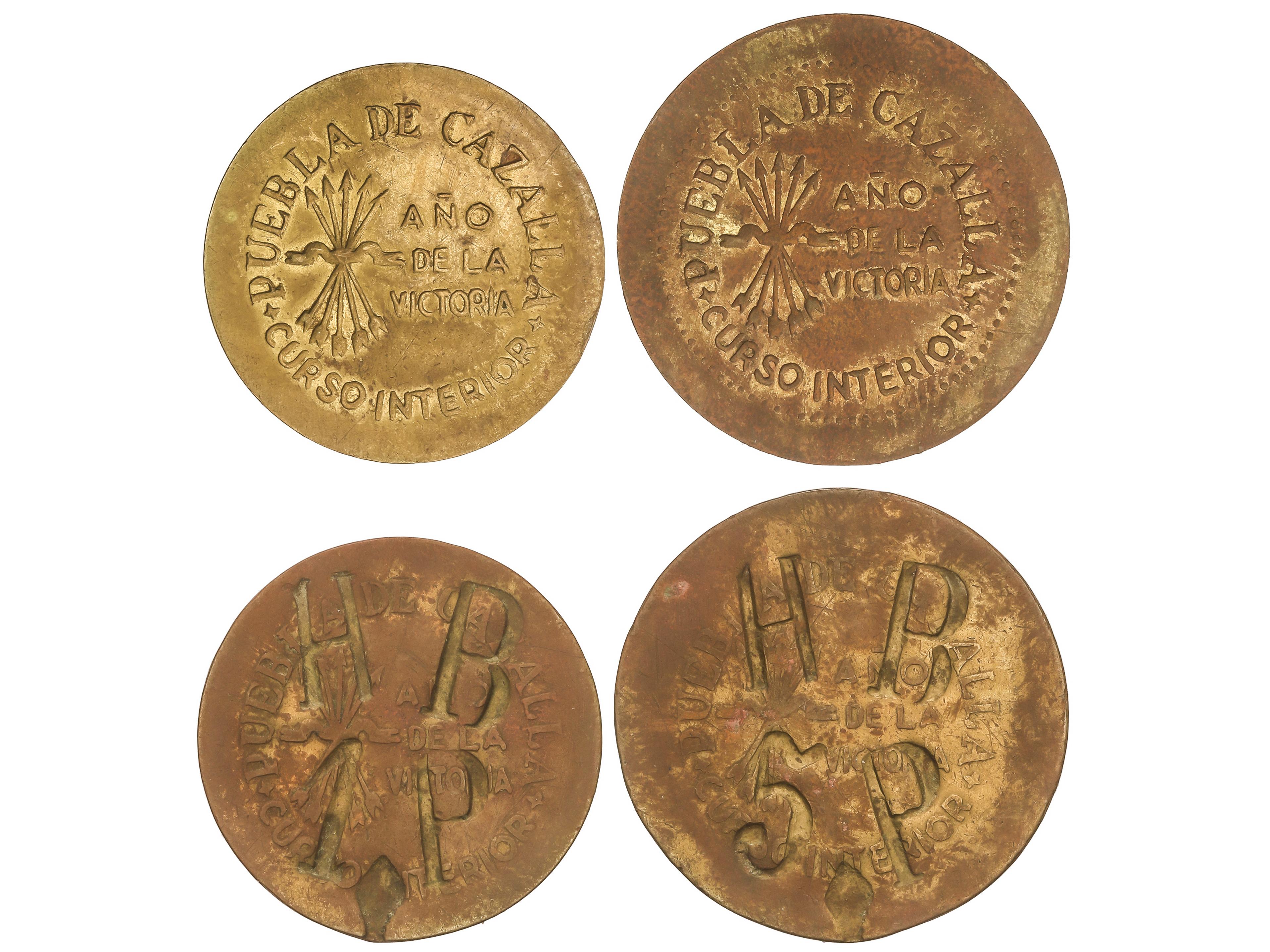 667 imageLote 4 monedas 10 (2) y 25 Céntimos (2). PUEBLA DE CAZALLA. Latón. Dos con resello HB/1P y HB/5P. MUY ESCASAS. AC-47 y 49, HG-236/7. MBC. (Image1)