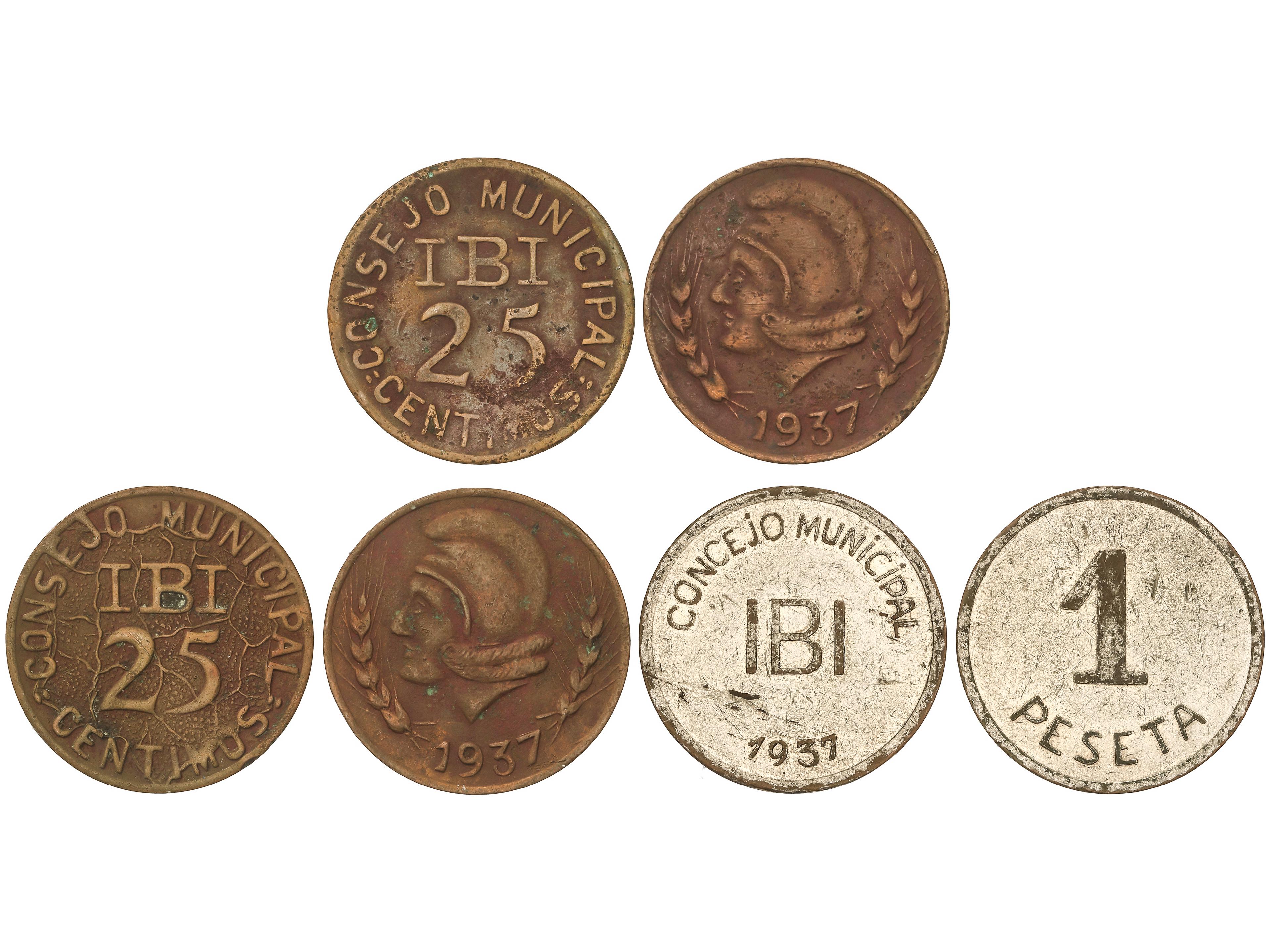 664 imageLote 3 monedas 25 Céntimos (2) y 1 peseta. 1937. C.M. de IBI. AE (2) y latón niquelado. Vti-L25, 26, L27. MBC a MBC+. (Image1)