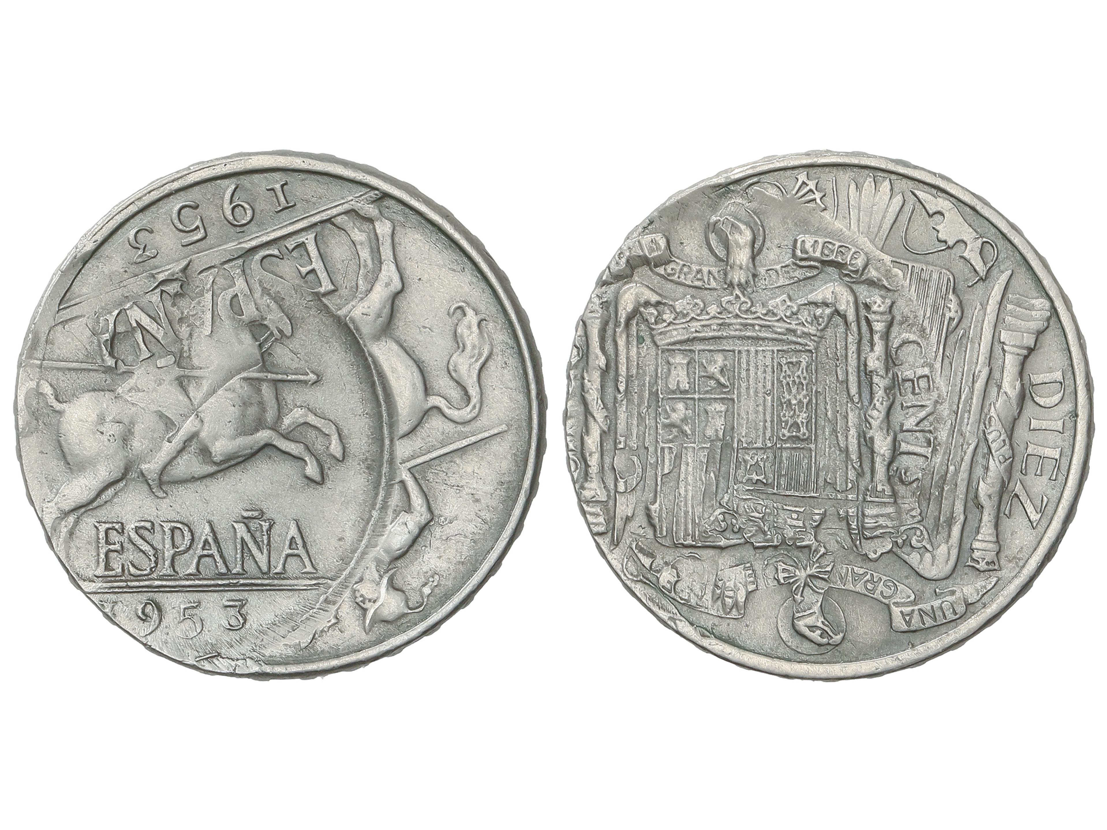 671 image10 Céntimos. 1953. ERROR: Doble acuñación de una de 5 Céntimos sobre una de 10. EBC-. (Image1)