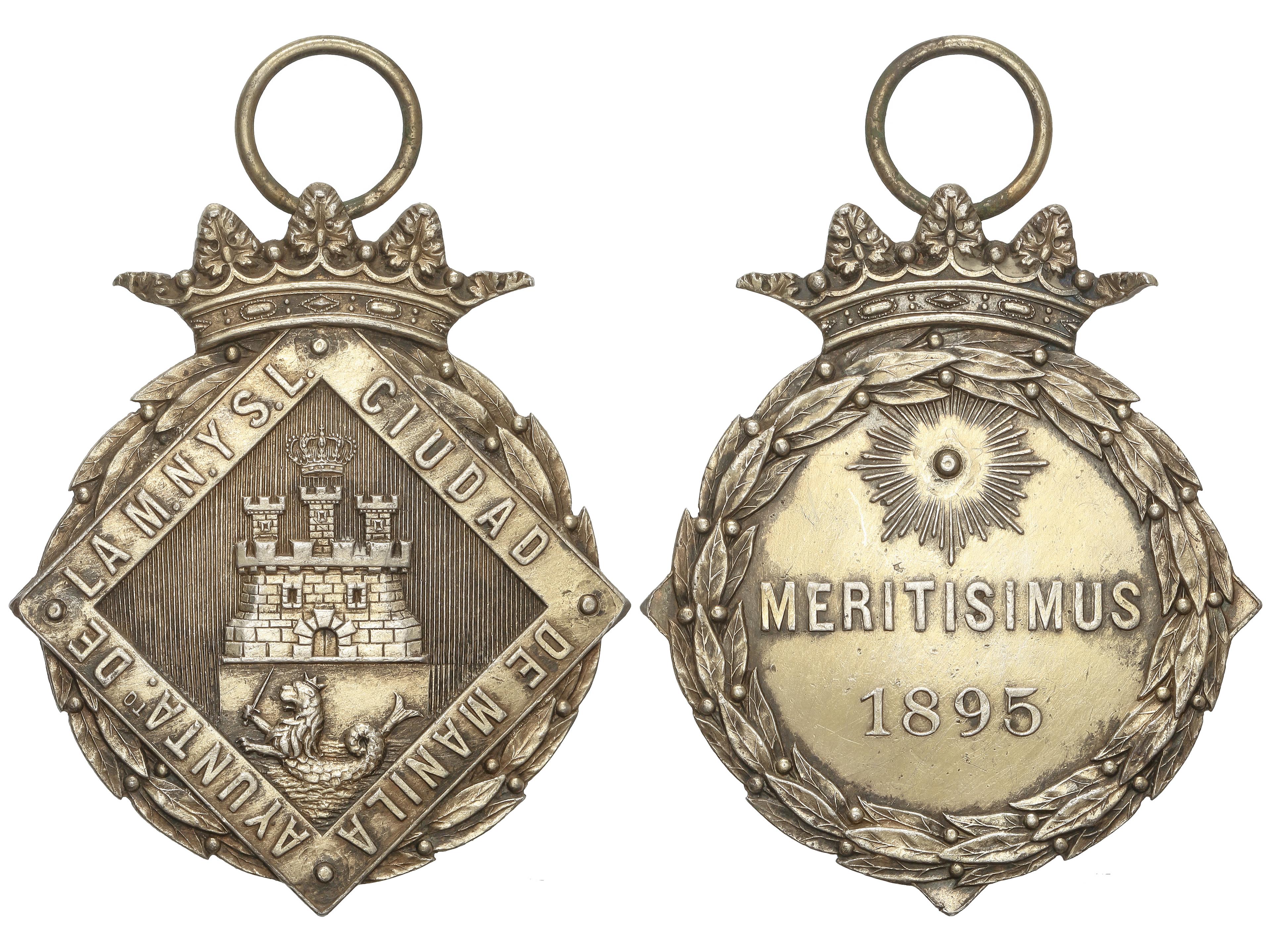 812 imageMedalla Ayuntamiento. 1895. MANILA. Anv.: AYUNTAto DE LA M.N.Y S.L. CIUDAD DE MANILA. Rev.: MERITISIMUS/1895. 27,71 grs. AR. Ø 48x40 mm. MUY RARA. Honeycutt-38. EBC-. (Image1)