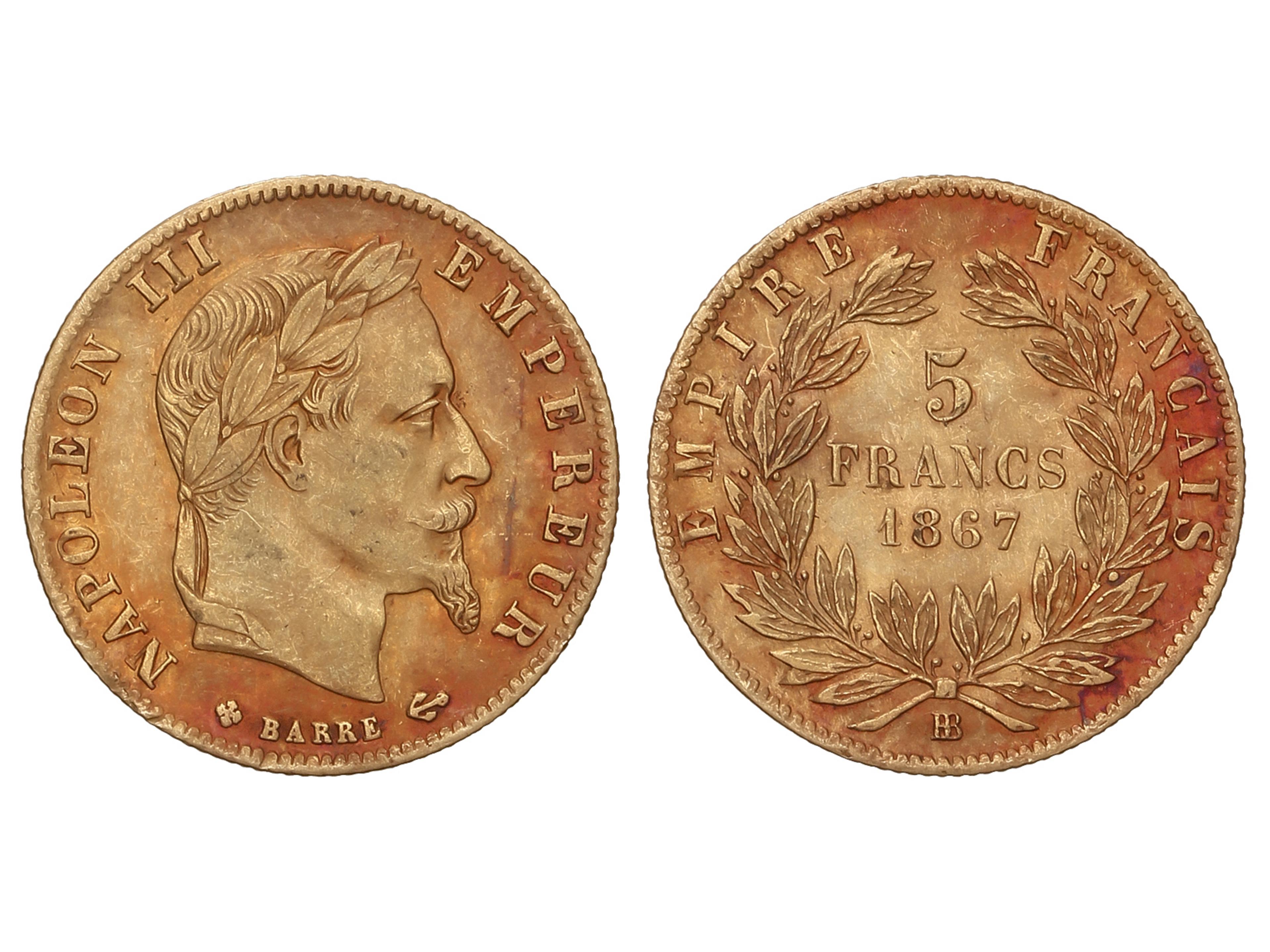 814 image5 Francs. 1867-BB. NAPOLEON III. STRASBOURG. 1,60 grs. AU (900). Ligera pátina irisada. Fr-589; KM-803.2. MBC+. (Image1)