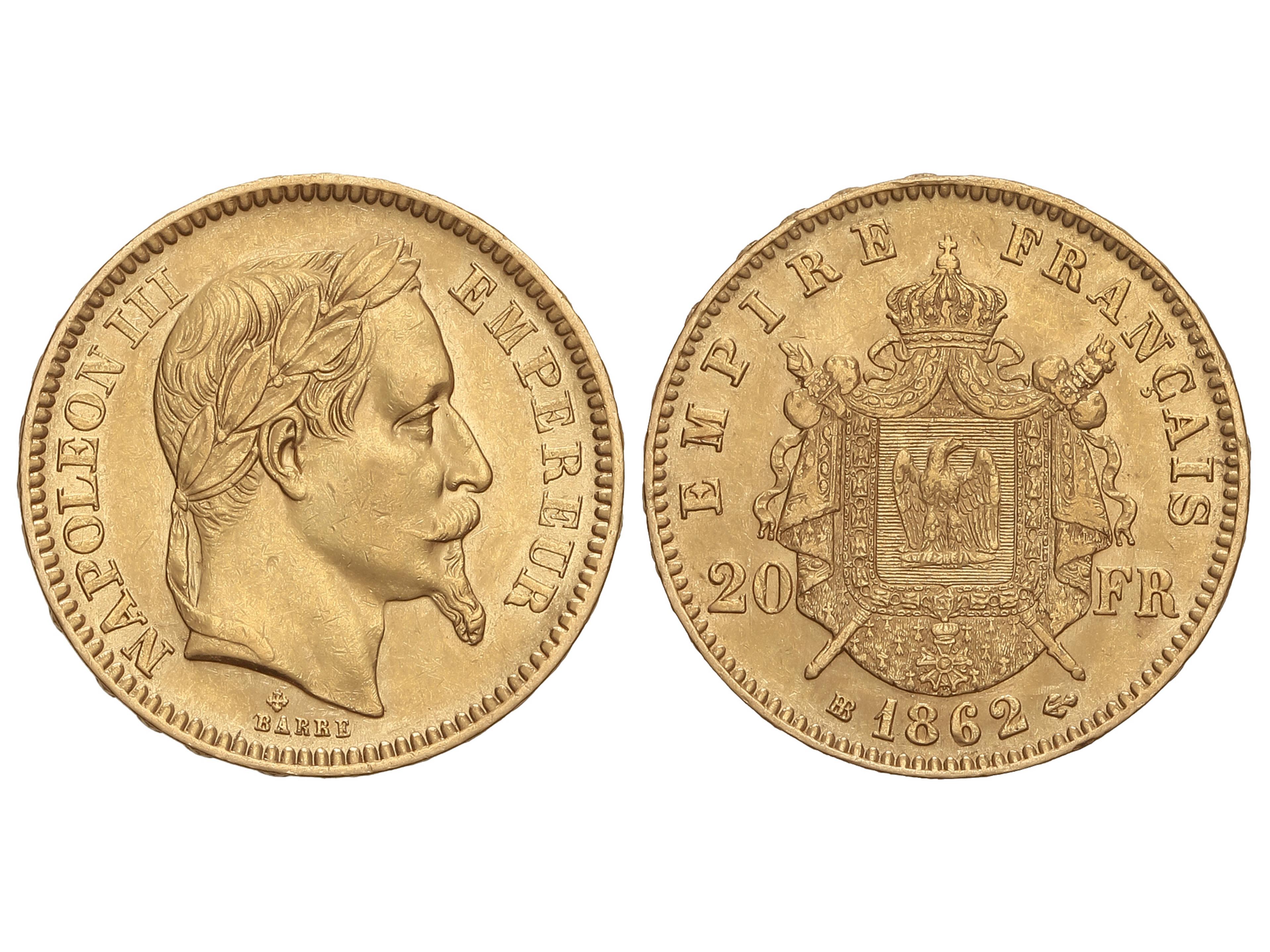 820 image20 Francs. 1862-BB. NAPOLEON III. STRASBOURG. 6,42 grs. AU (900). (Leves golpecitos). Fr-585; KM-801.2. EBC-/MBC+. (Image1)