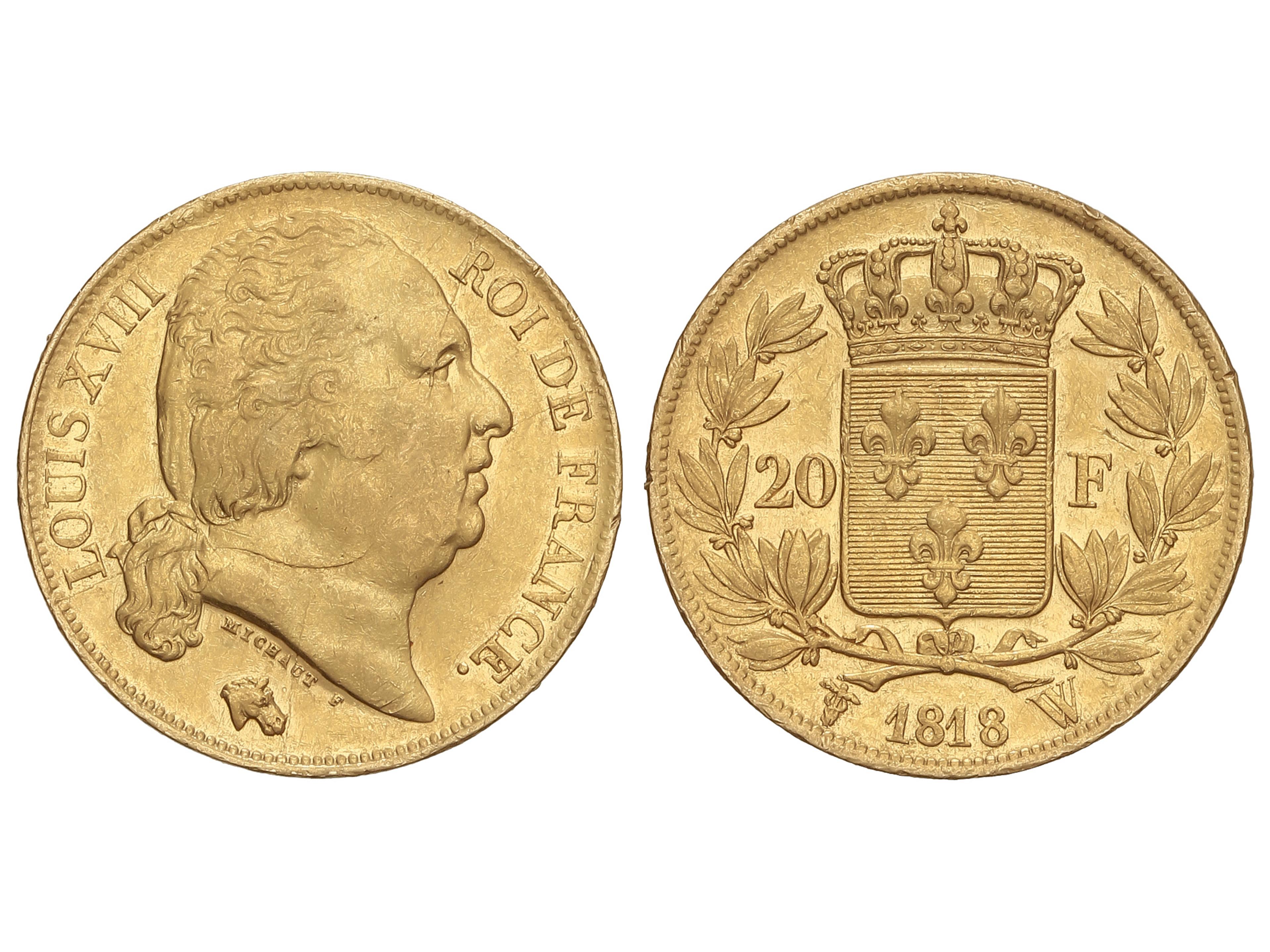 816 image20 Francs. 1818-W. LOUIS XVIII. LILLE. 6,41 grs. AU (900). (Pequeñas roturas de cuño en anverso). Fr-539; KM-712.9. MBC+. (Image1)
