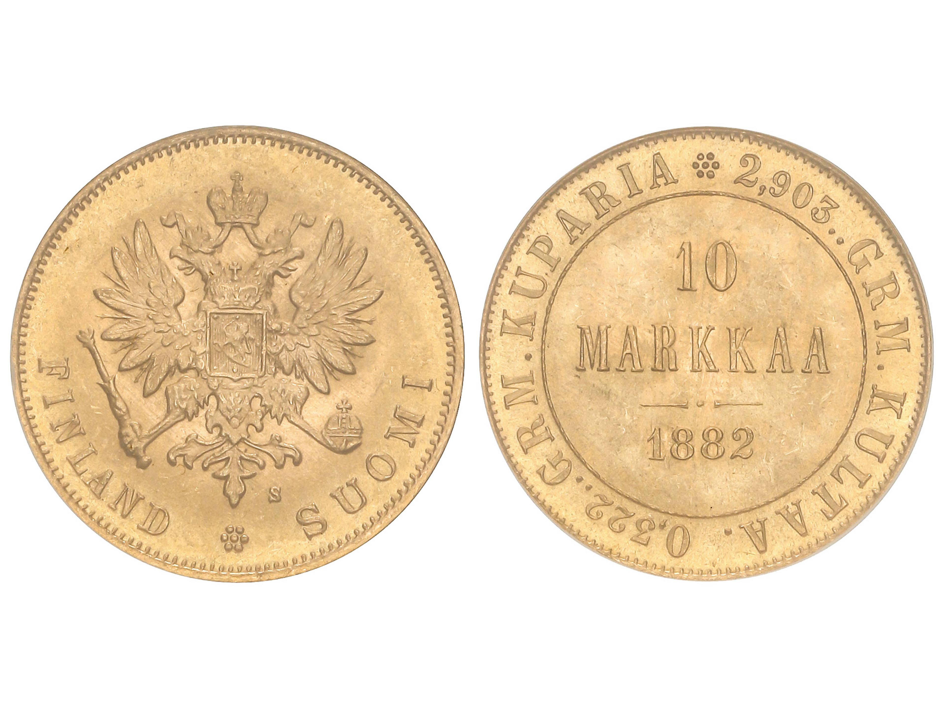 813 image10 Markkaa. 1882-S. ALEXANDER III. Encapsulada por NUMISMATIC GUARANTY CORPORATION OF AMERICA MS65 (n. 155755-067). AU. Brillo original. RARA EN ESTA CALIDAD. BELLO EJEMPLAR. Fr-5; KM-8.2. SC. Ex Ira & Larry Goldberg - 06 septiembre 2011, n. 4289. (Image1)