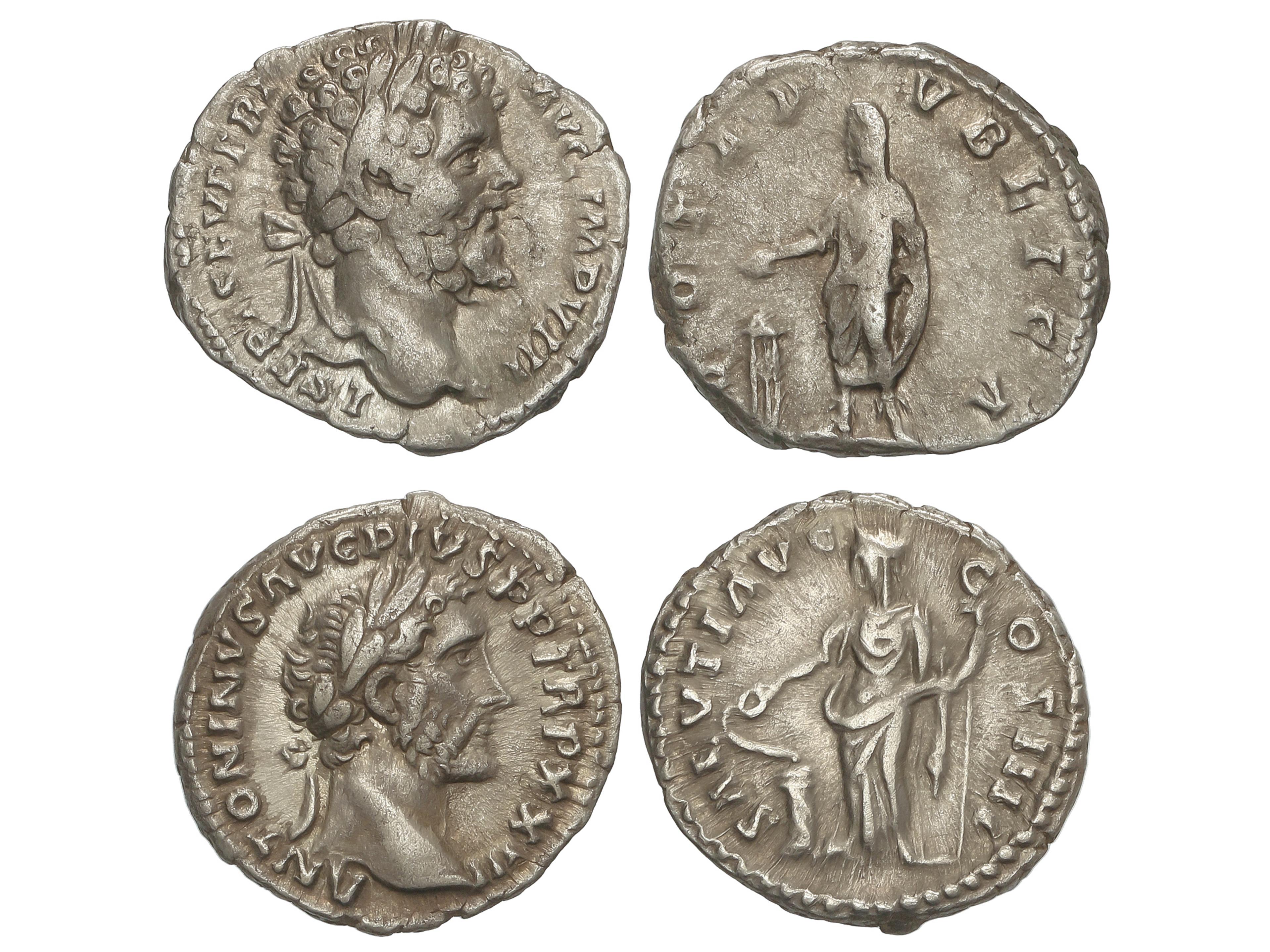 2028 imageLote 2 monedas Denario. ANTONINO PÍO y SEPTIMIO SEVERO. AR. Antonino Pío: SALVTI AVG. COS. IIII RIC-305. Septimio Severo: VOTA PVBLICA RIC-96a. MBC- a MBC. (Image1)