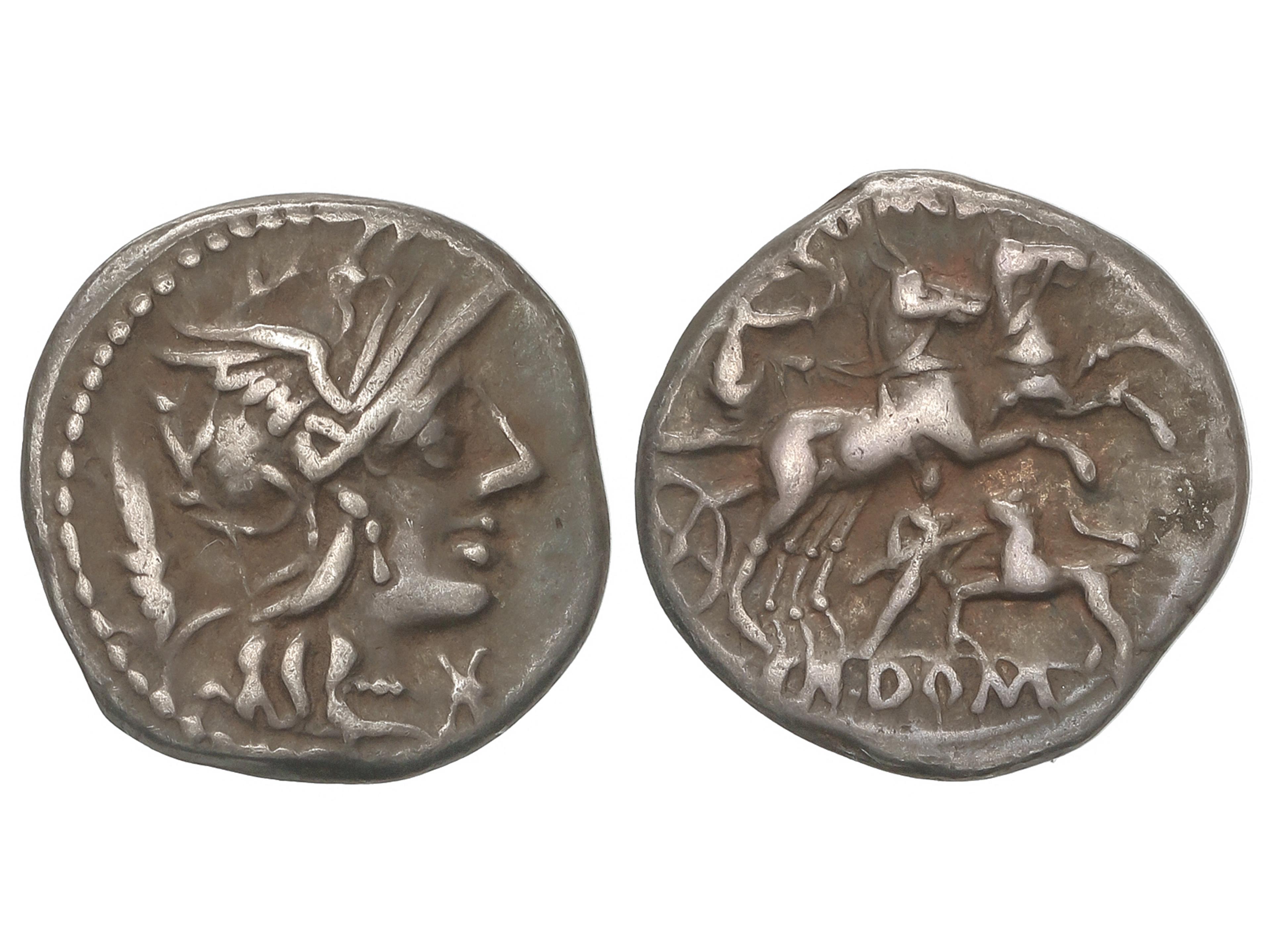 2022 imageDenario. 128 a.C. DOMITIA. Cn. Domitius Ahenobarbus. Rev.: Victoria en biga a derecha. entre ROMA y CN. DOM. 3,87 grs. AR. (Pátina oscura). BMC-1025; Cal-543; Craw-261.1; FFC-680; Se-14. MBC. (Image1)