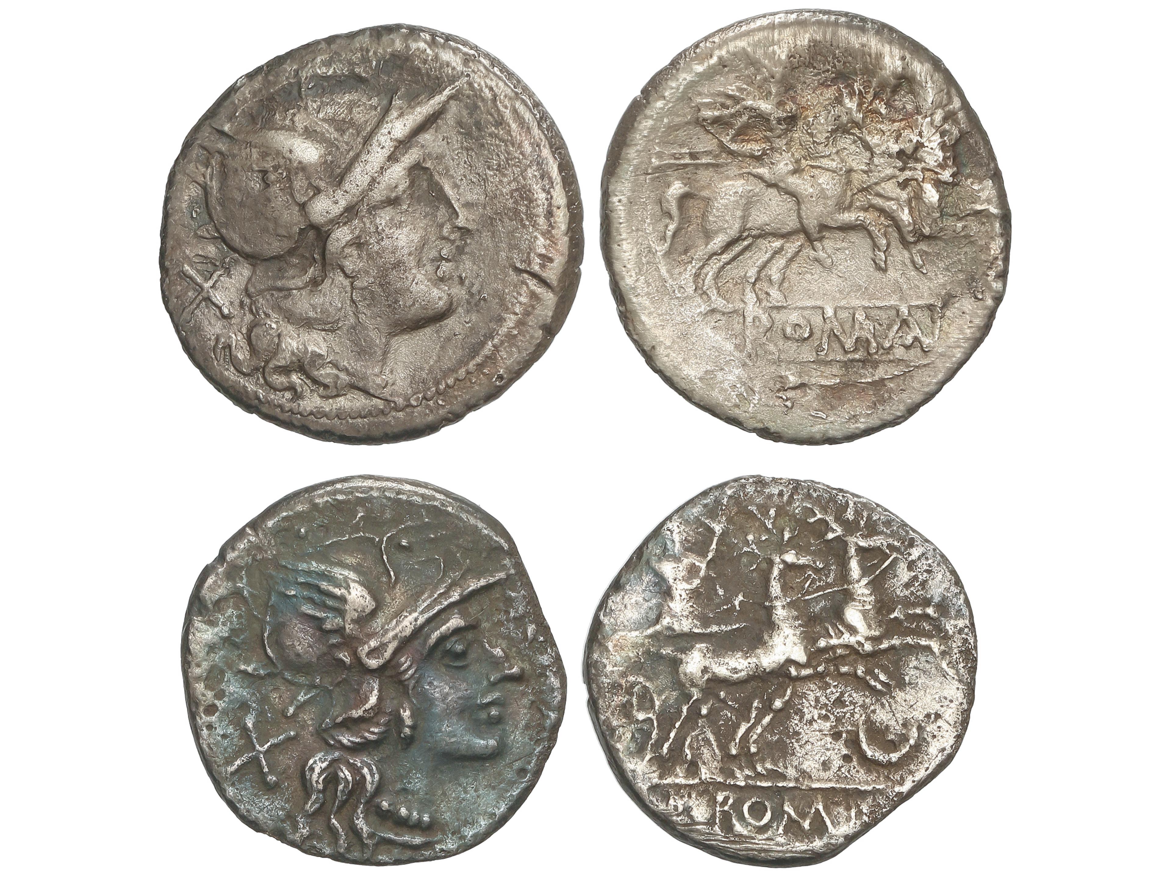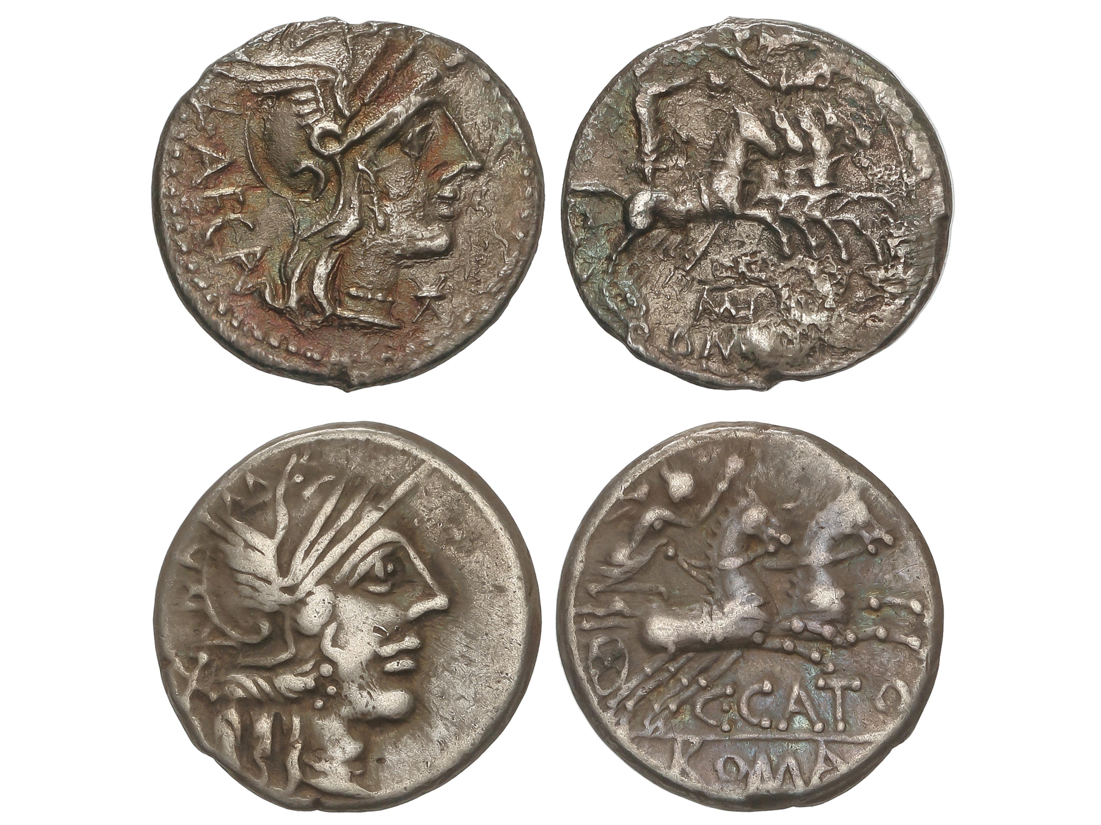 2025 imageLote 2 monedas Denario. 125 a 123 a.C. PORCIA. 3,89 y 3,18 grs. AR. (La de ley. LAECA en anverso con oxidaciones en reverso). MBC-. (Image1)