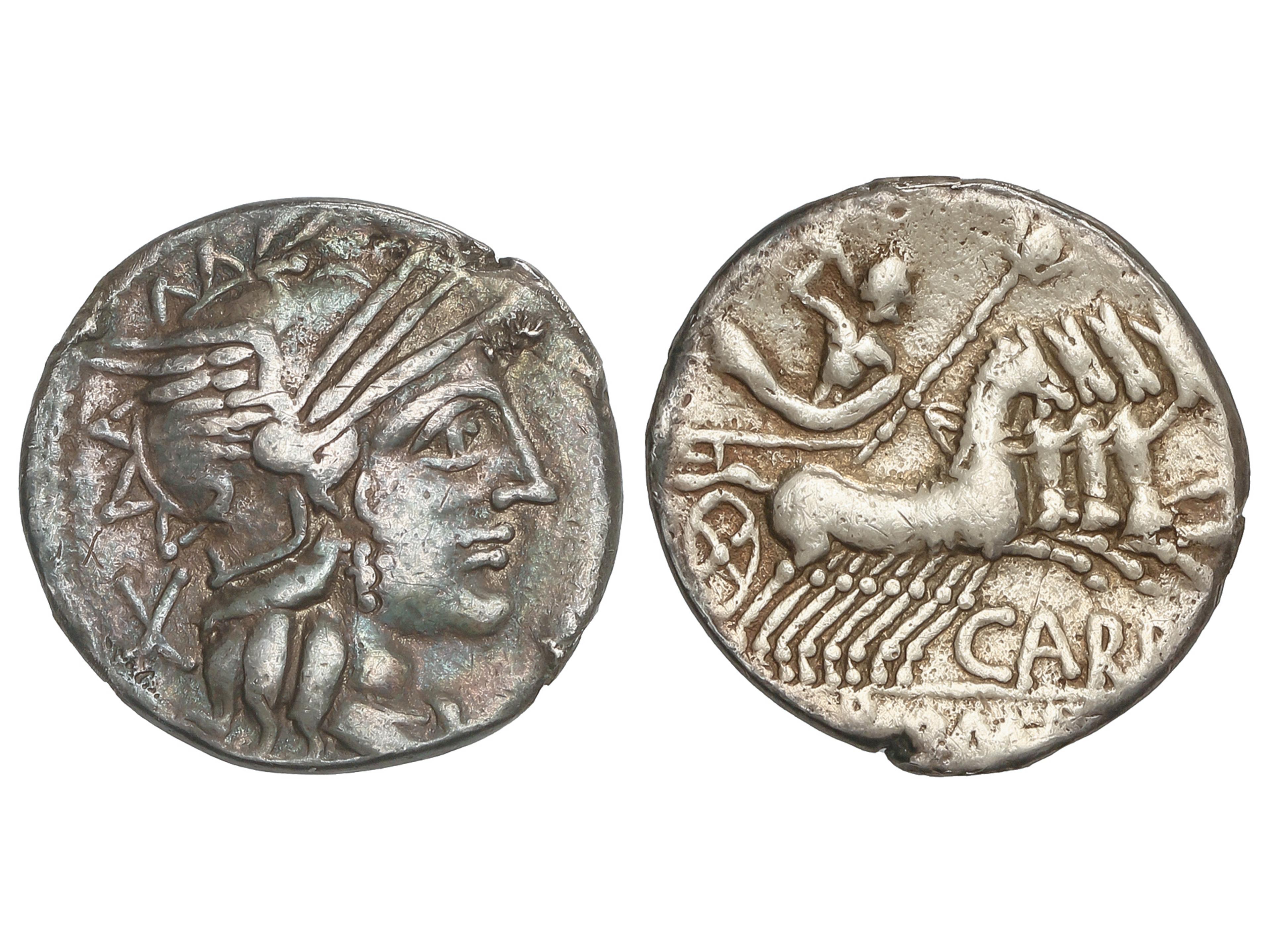 2024 imageDenario. 122 a.C. PAPIRIA. Papirius Carbo. Rev.: Júpiter en cuadriga a derecha, debajo CARB, EN EXERGO roma. 3,77 grs. AR. BMC-449; Cal-1062; Craw-279.1; FFC-958; Se-7. MBC. (Image1)