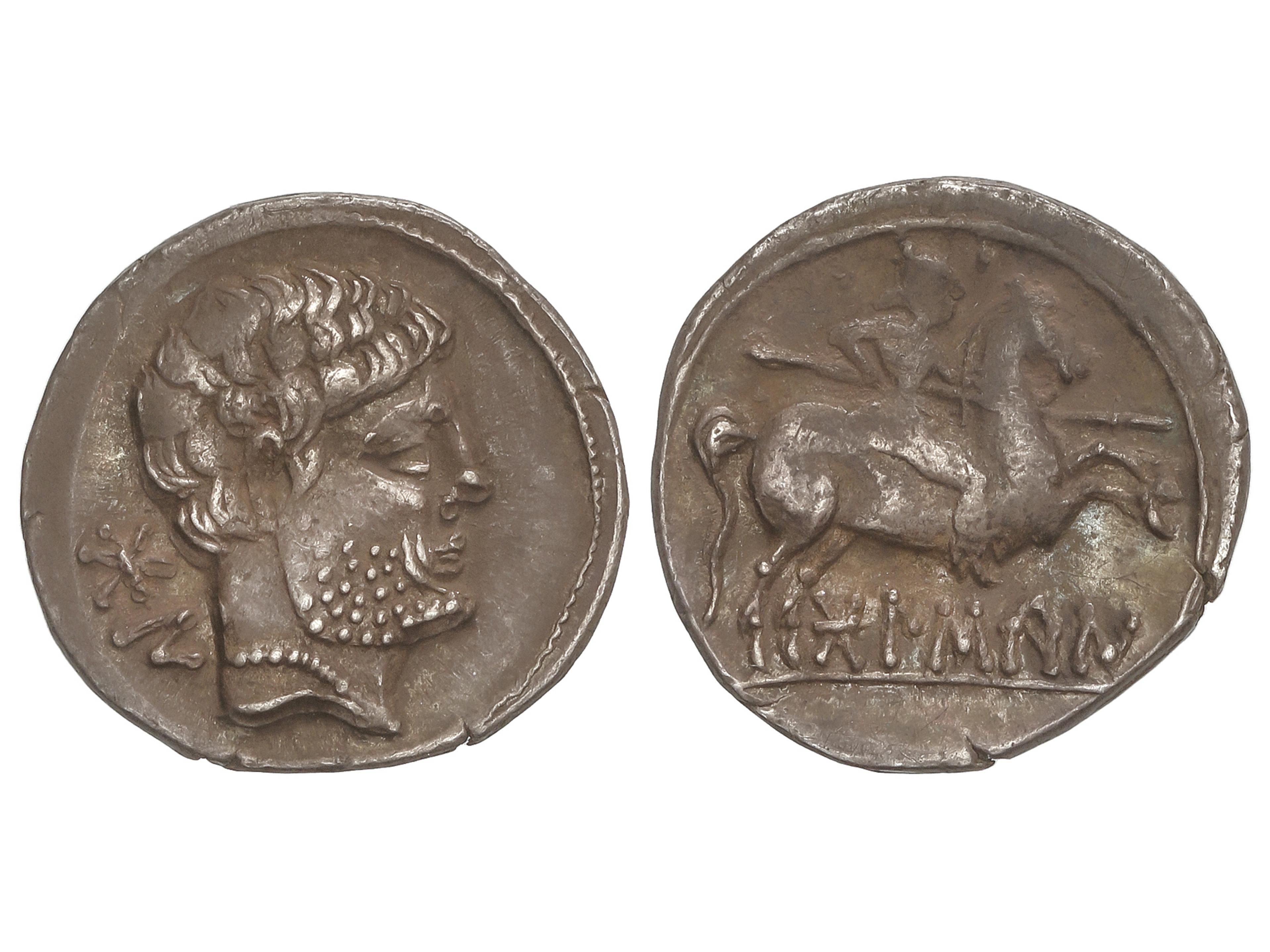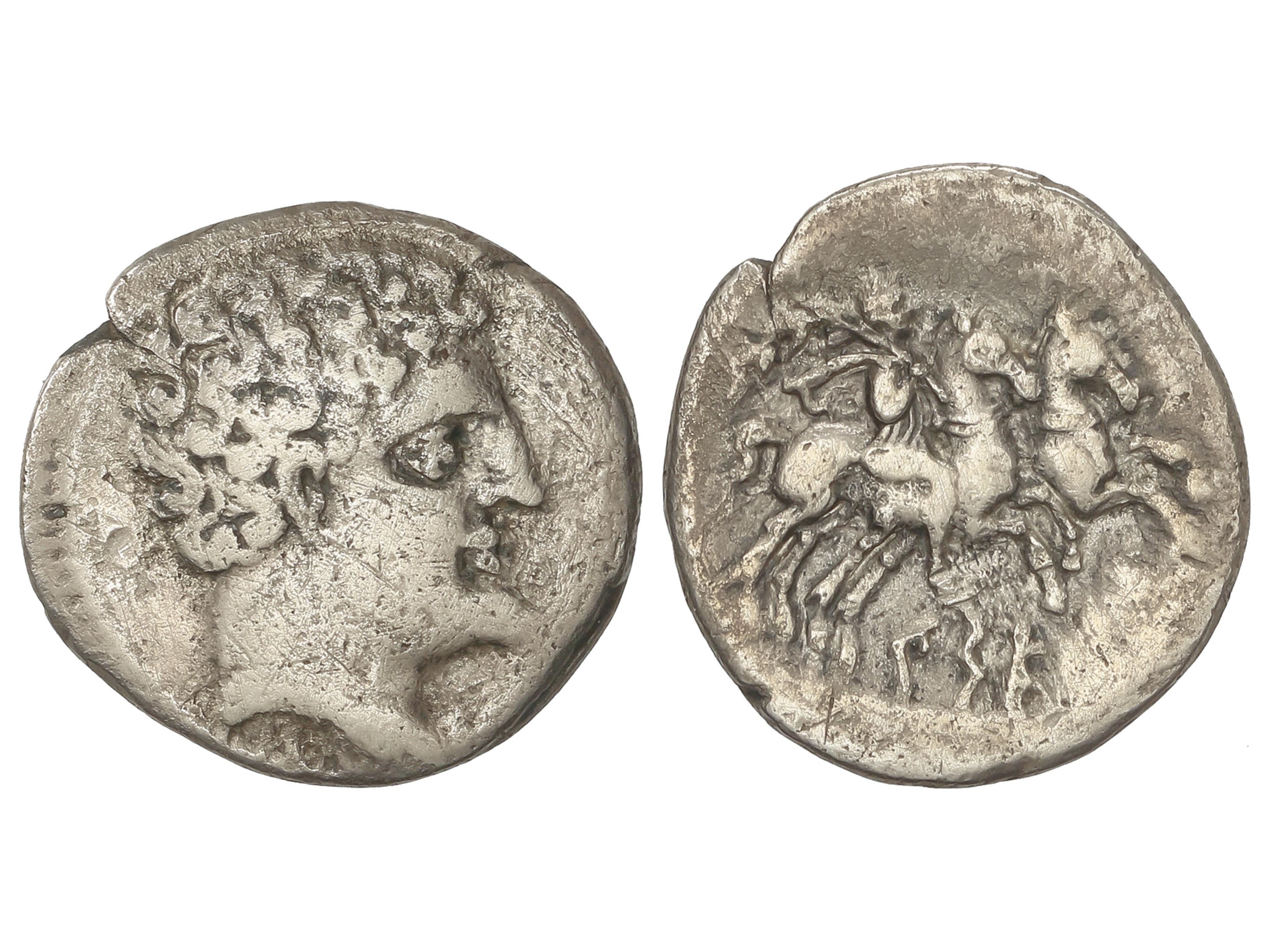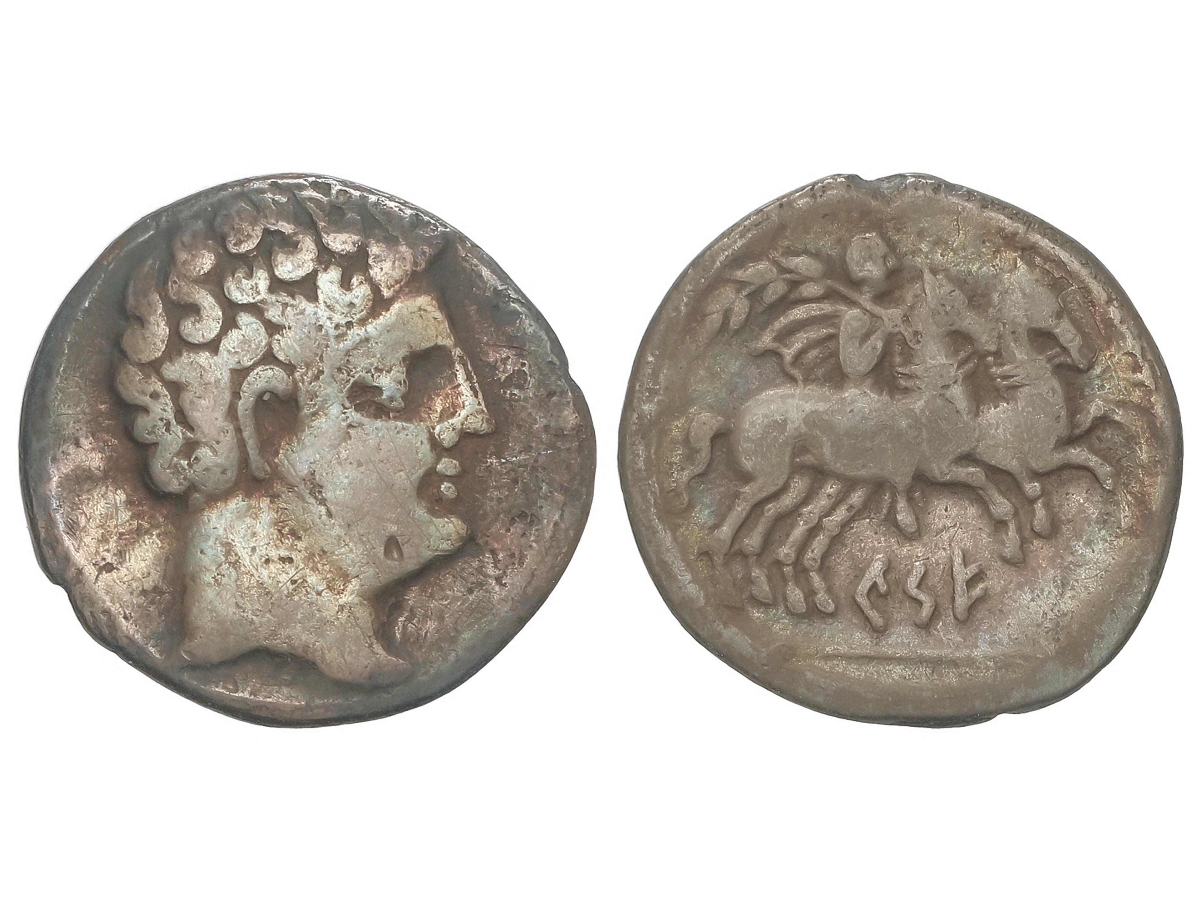2019 imageDenario. 120-20 a.C. CESE (TARRAGONA). Anv.: Cabeza masculina a derecha. Rev.: Jinete con palma a derecha conduciendo un segundo caballo. 3,62 grs. AR. Pátina. ESCASA. AB-2266; ACIP-1122. MBC-. (Image1)