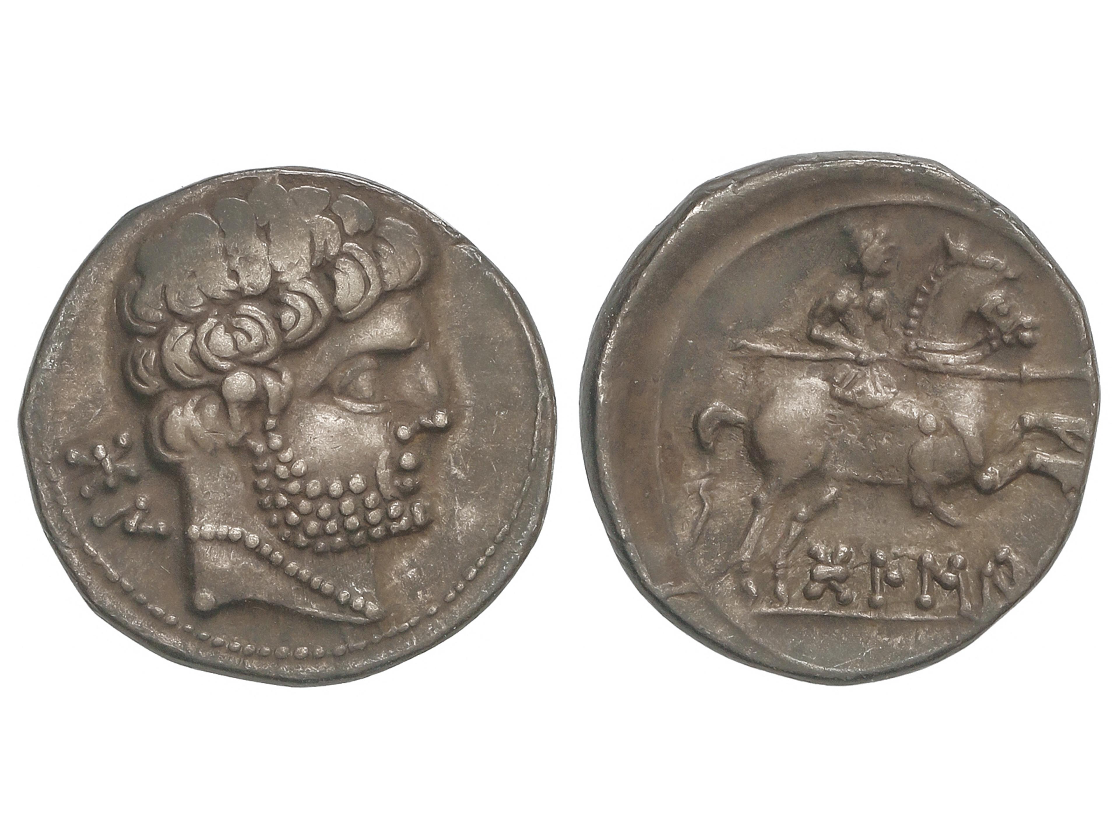 2015 imageDenario. 180-20 a.C. BOLSCAN. Anv.: Cabeza barbada a derecha, detrás signos ibéricos BoN. Rev.: Jinete con lanza, debajo leyenda ibérica. 3,77 grs. AR. Pátina. AB-1911. MBC+. (Image1)