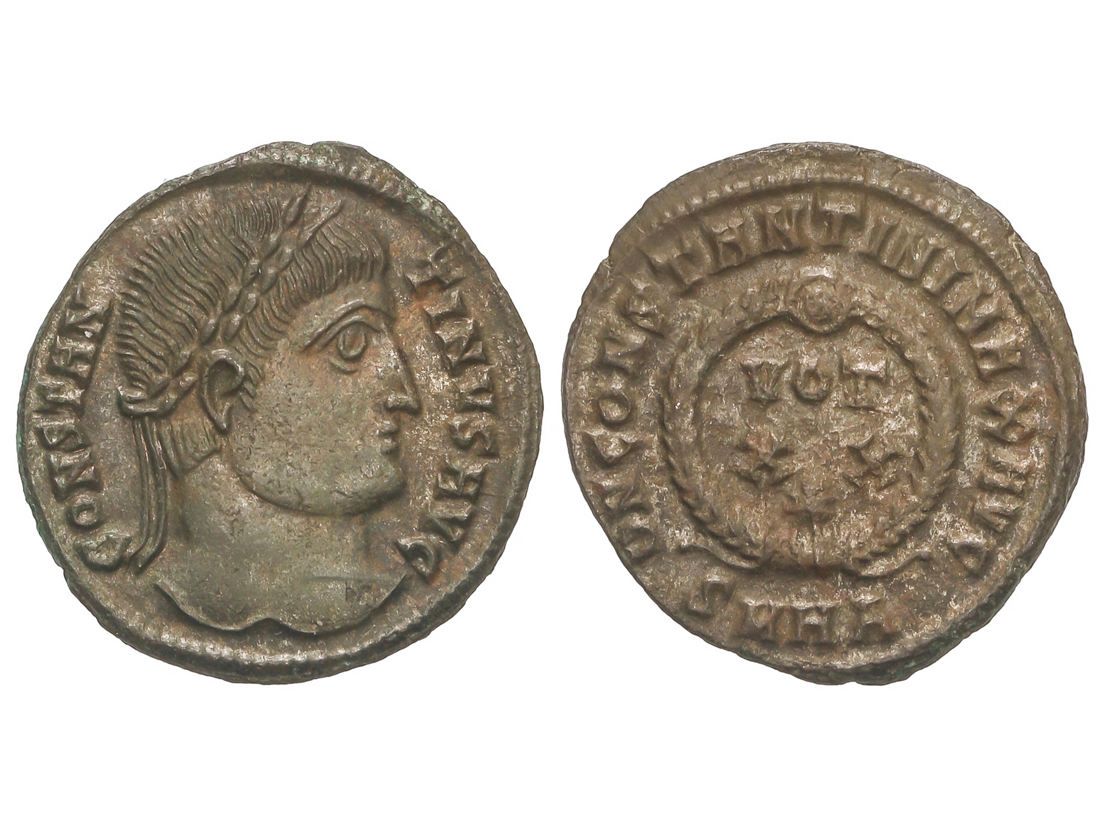 2027 imageFollis 19 mm. 320 d.C. CONSTANTINO MAGNO. Anv.: CONSTANTINVS AVG. Busto laureado a derecha. Rev.: D. N. CONSTANTINI MAX. AVG. Dentro de corona de laurel:VOT. XX, debajo SMHA. 3,24 grs. AE. C-123. EBC-. (Image1)