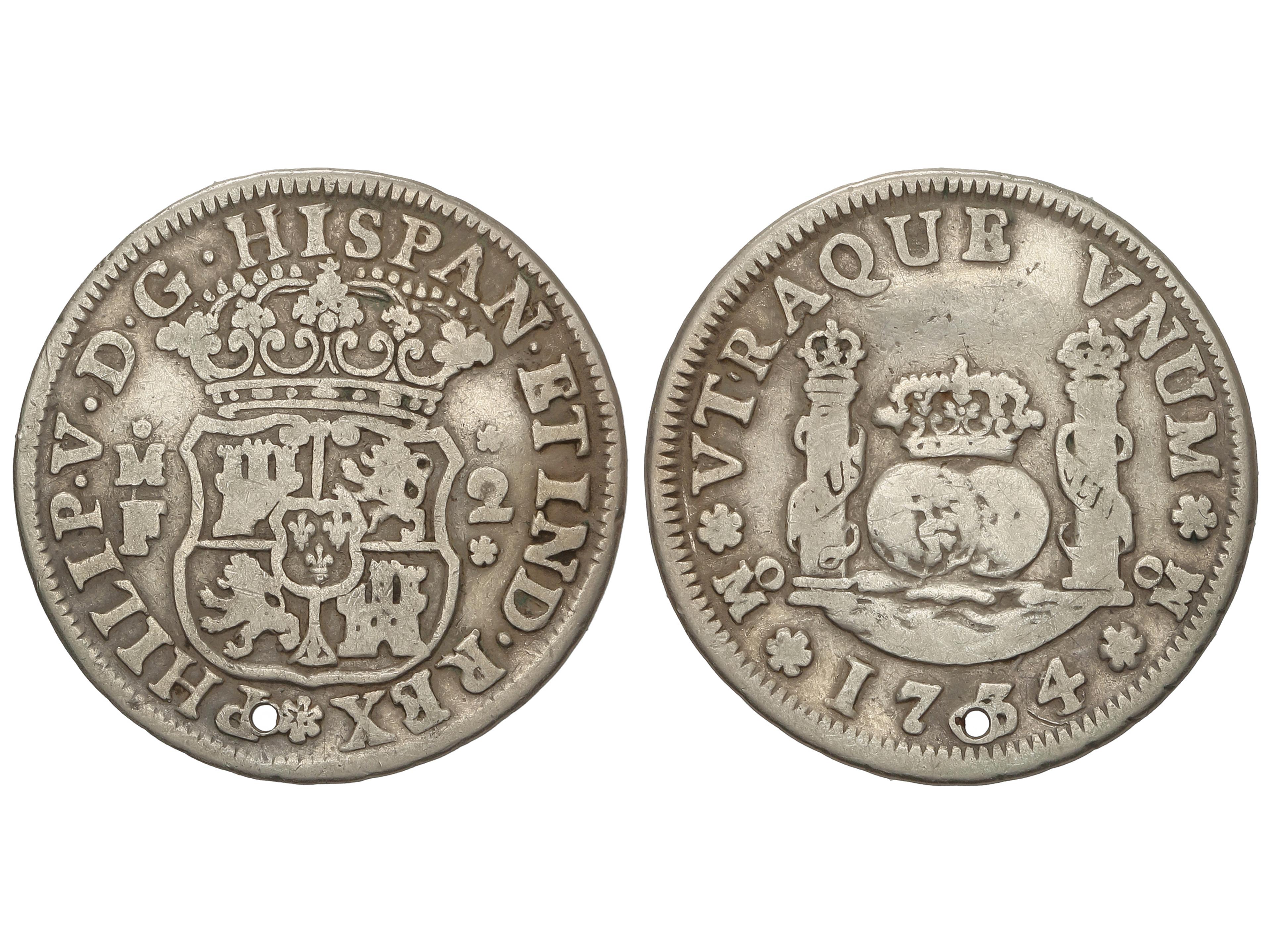 2159 image2 Reales. 1734. MÉXICO. M.F. 6,30 grs. Columnario. (Perforación). AC-808. MBC-. (Image1)