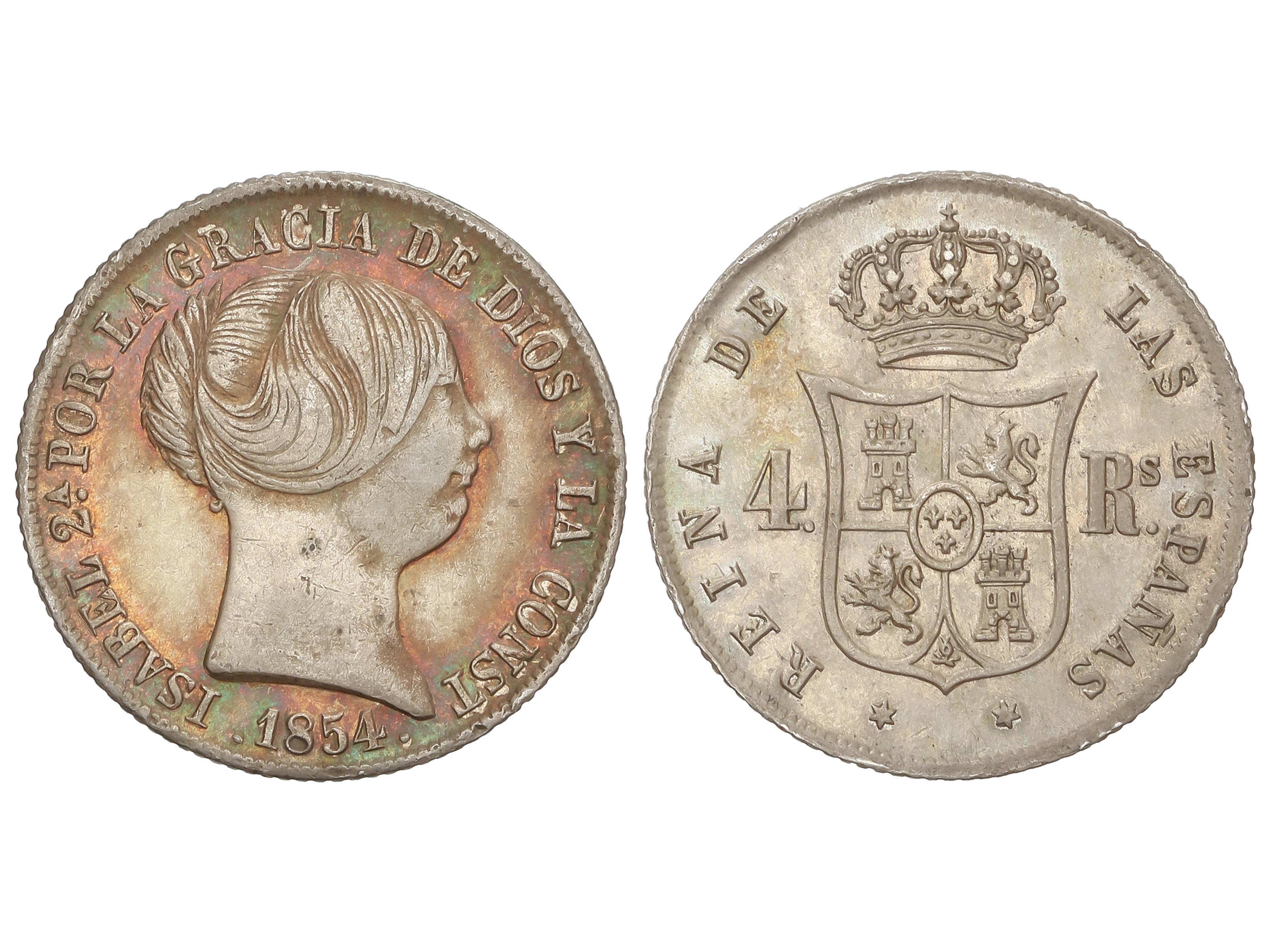 4 Reales. 1854. MADRID. 5,16 grs. (Manchita en anverso). Bonita pátina irisada en anverso, restos de brillo en reverso. AC-427. MBC/EBC-. Ex Áureo & Calicó `O´Callaghan´ - 10 noviembre 2016, n. 327. (Image1)