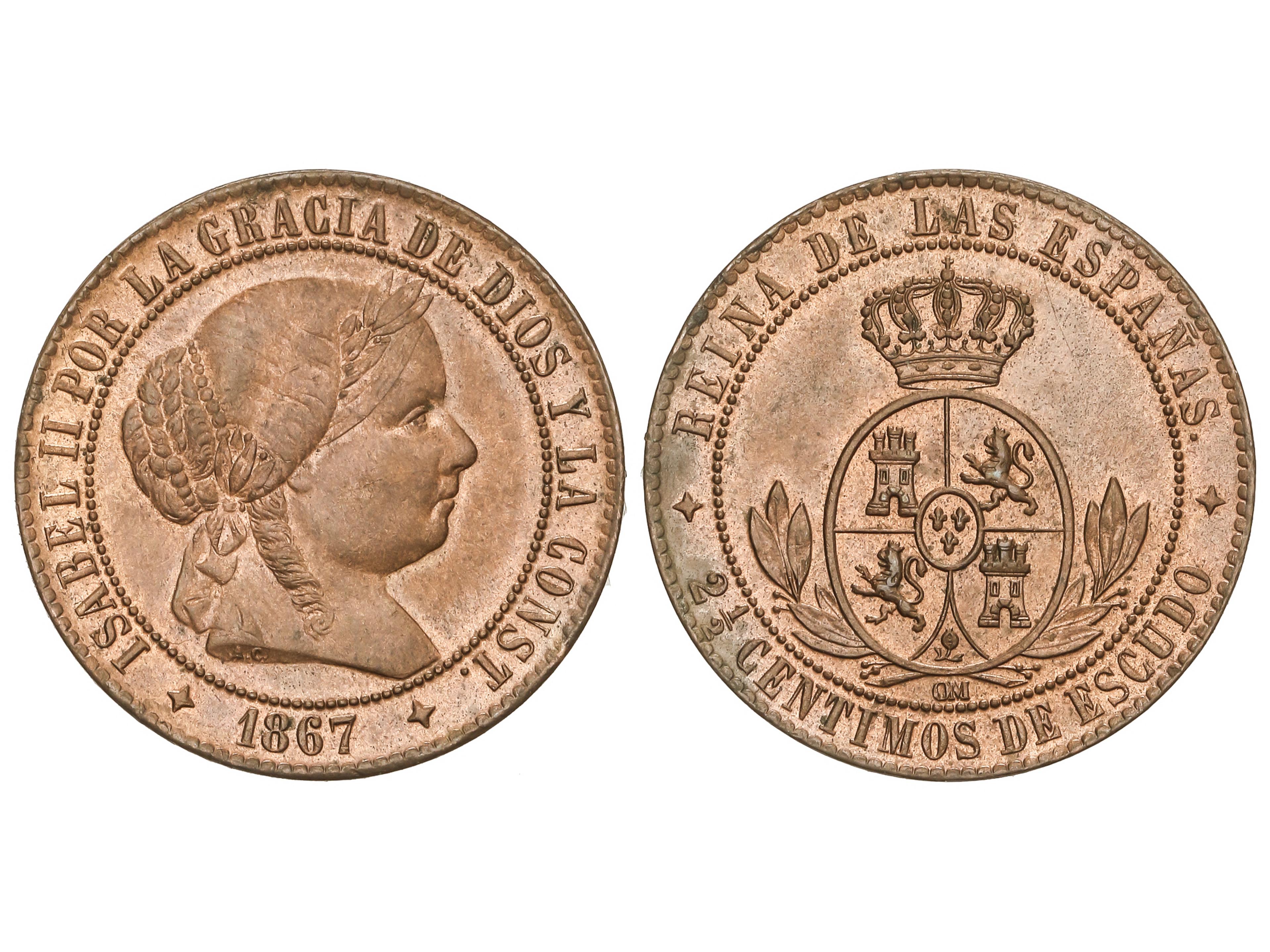 2 1/2 Céntimos de Escudo. 1867. JUBIA. O.M. 6,09 grs. Bella. Brillo original. AC-236. EBC. Ex Áureo & Calicó `O´Callaghan´ - 10 noviembre 2016, n. 163. (Image1)