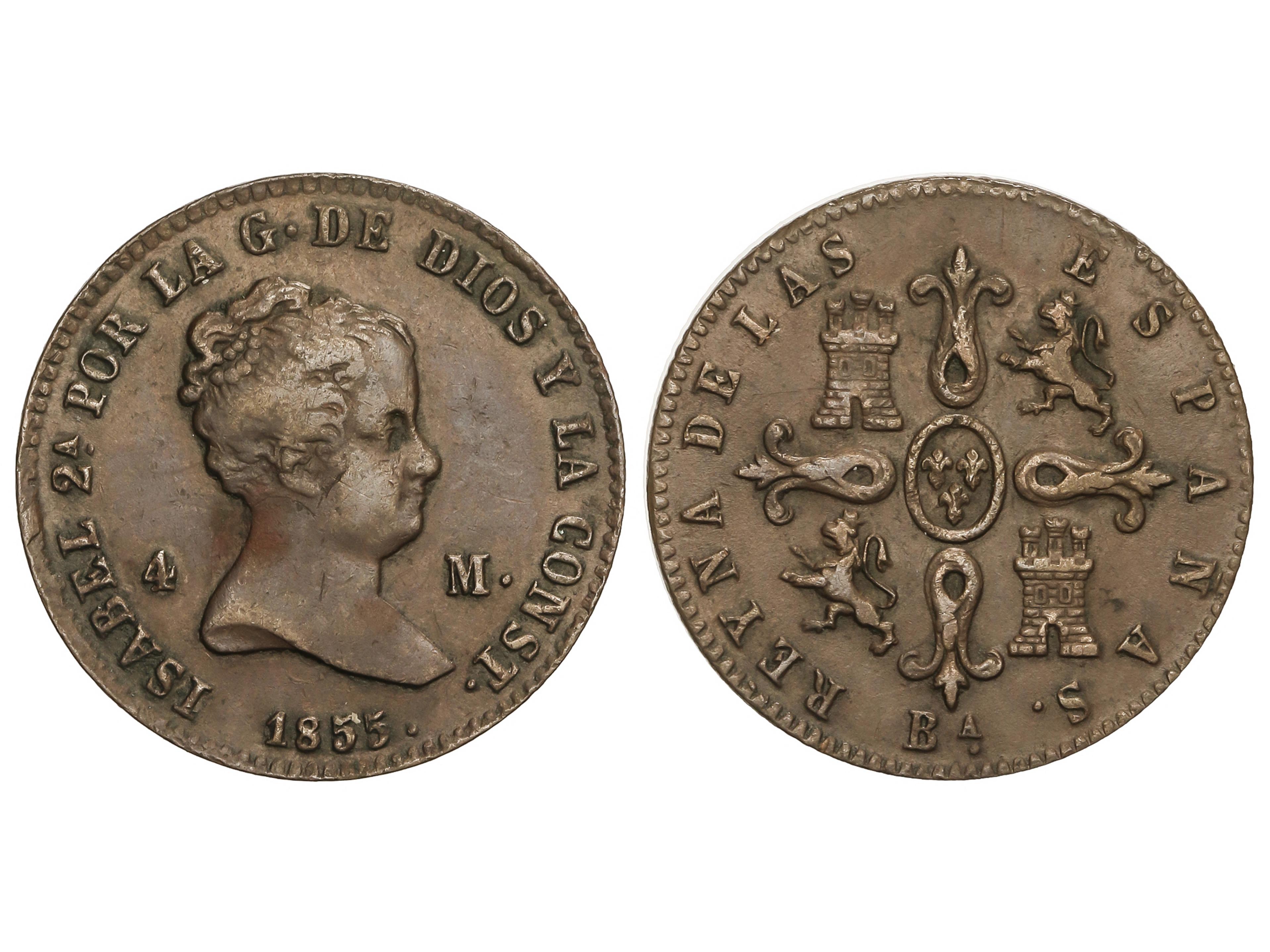 4 Maravedís. 1855. BARCELONA. 5,32 grs. ESCASA. AC-65. MBC/MBC+. Ex Áureo & Calicó `O´Callaghan´ - 10 noviembre 2016, n. 29.