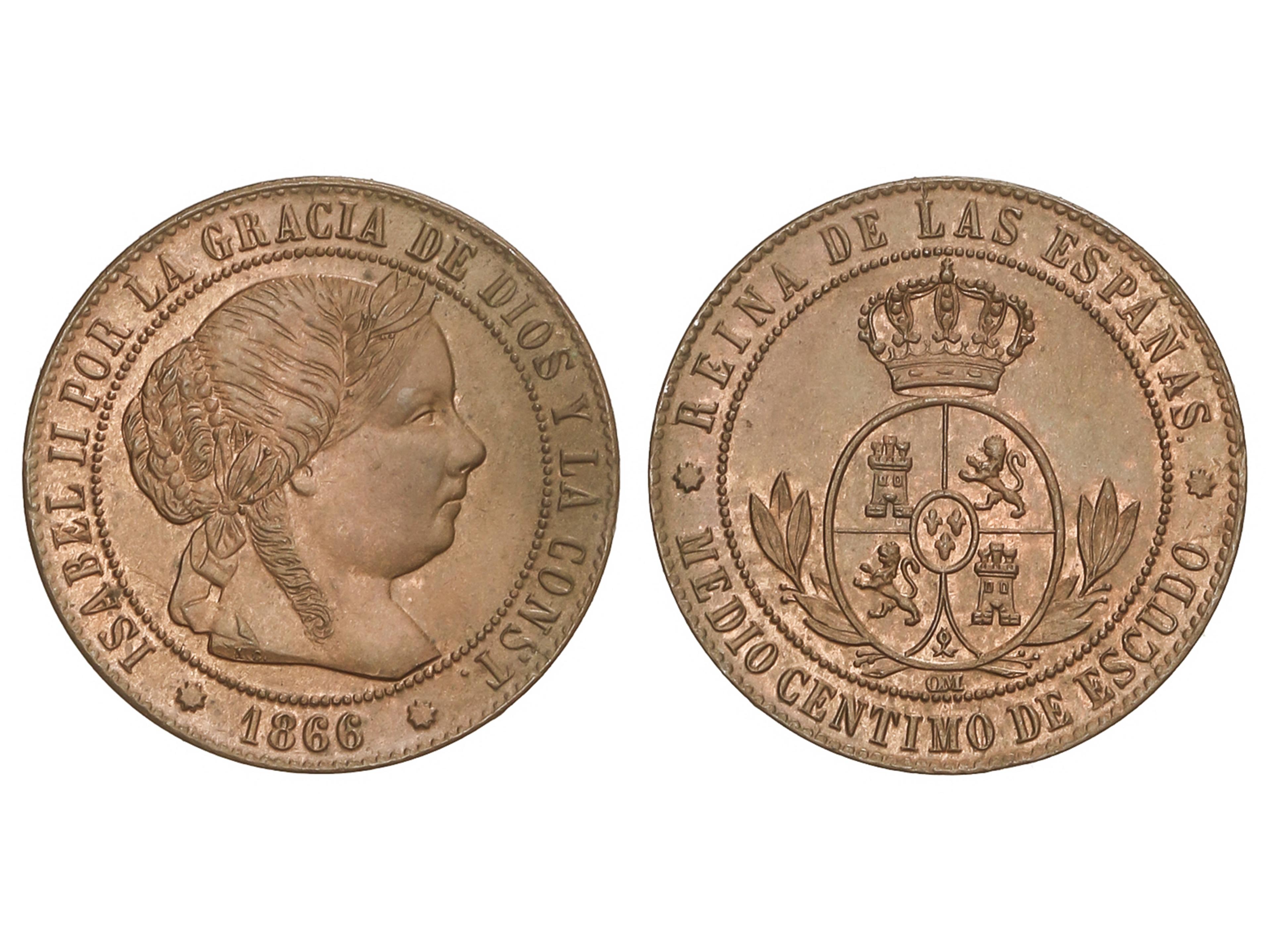 1/2 Céntimo de Escudo. 1866. BARCELONA. O.M. 1,26 grs. Muy bella con brillo original. AC-199. SC-. Ex Áureo & Calicó `O´Callaghan´ - 10 noviembre 2016, n. 132. (Image1)