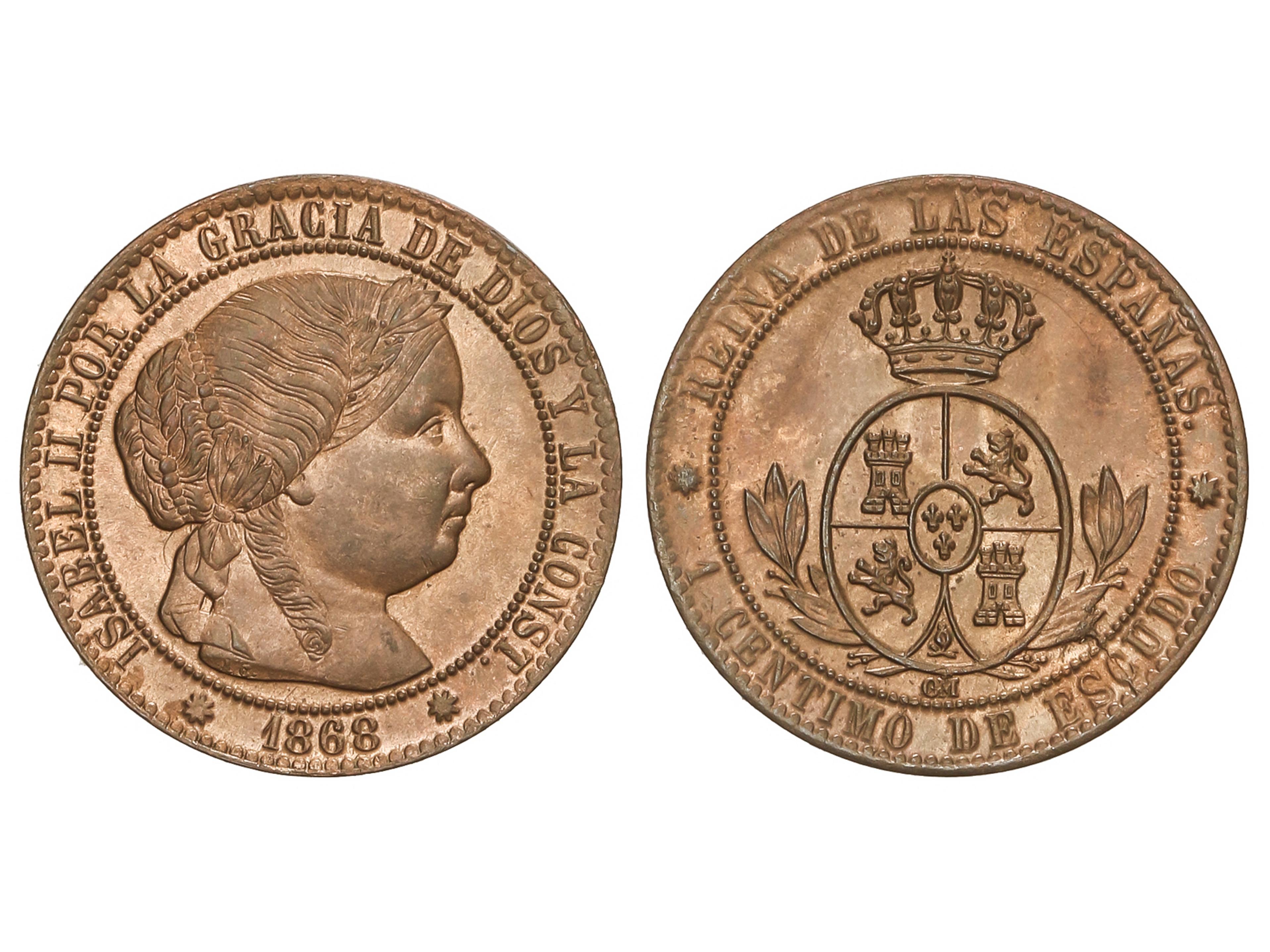 1 Céntimo de Escudo. 1868. BARCELONA. O.M. 2,59 grs. Acuñación algo floja en parte. Bella con brillo original. AC-216. SC-. Ex Áureo & Calicó `O´Callaghan´ - 10 noviembre 2016, n. 3479. (Image1)