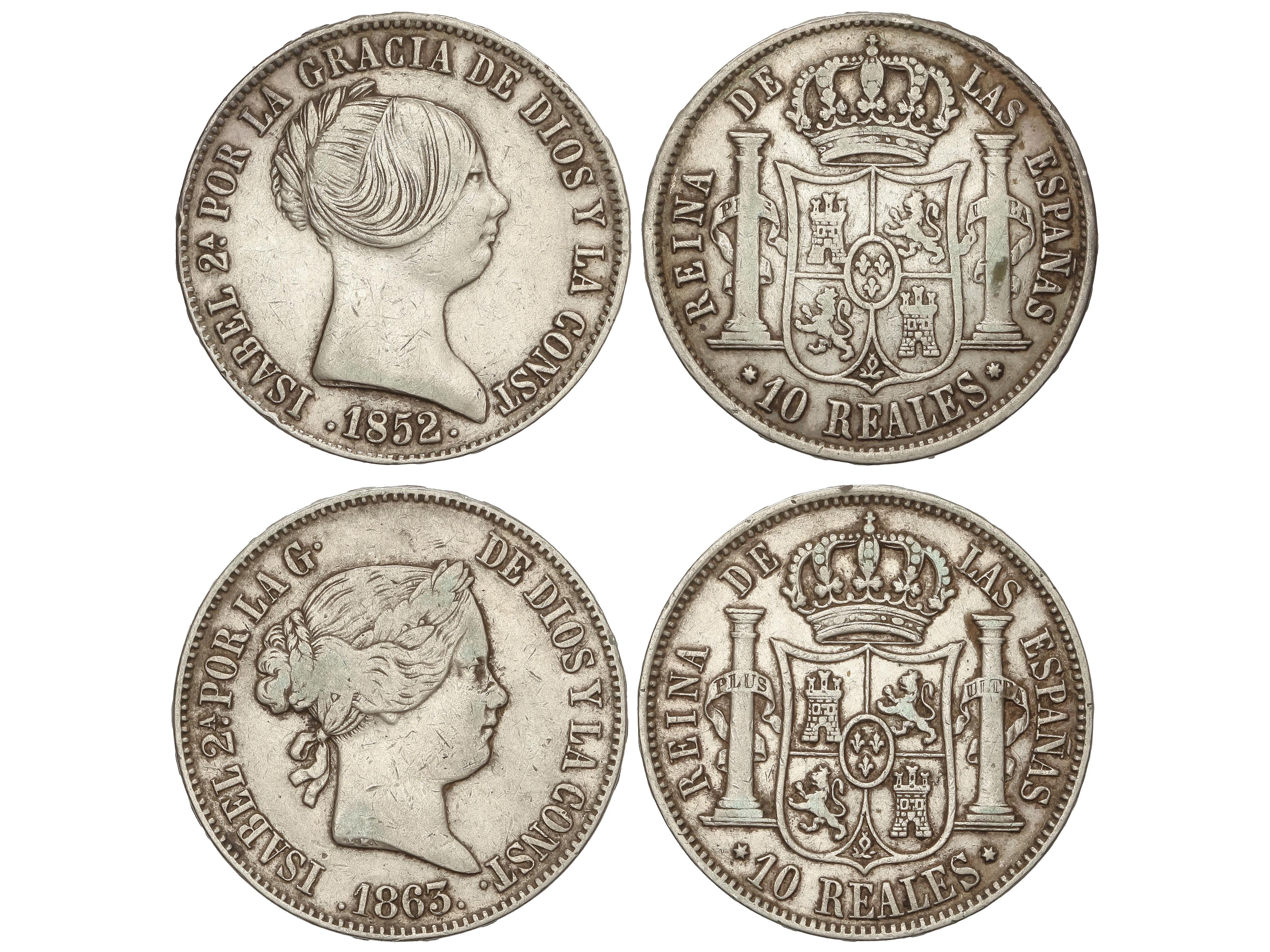 Lote 2 monedas 10 Reales. 1852 y 1863. MADRID y SEVILLA. AC-540, 547. MBC. (Image1)