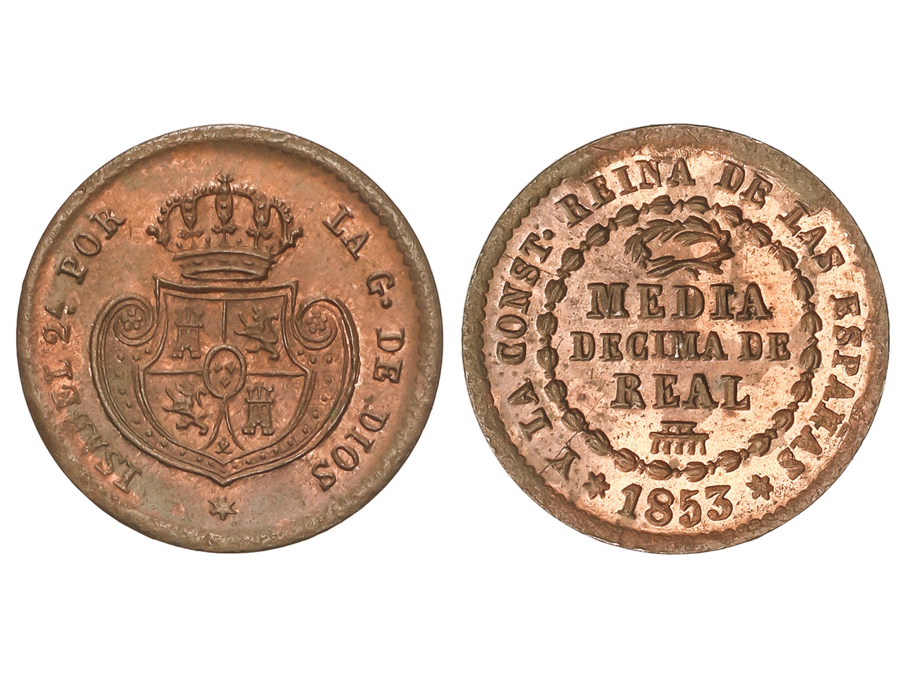 1/2 Décima de Real. 1853. SEGOVIA. 1,93 grs. Gran parte de color y brillo original. AC-140. EBC/EBC+. (Image1)