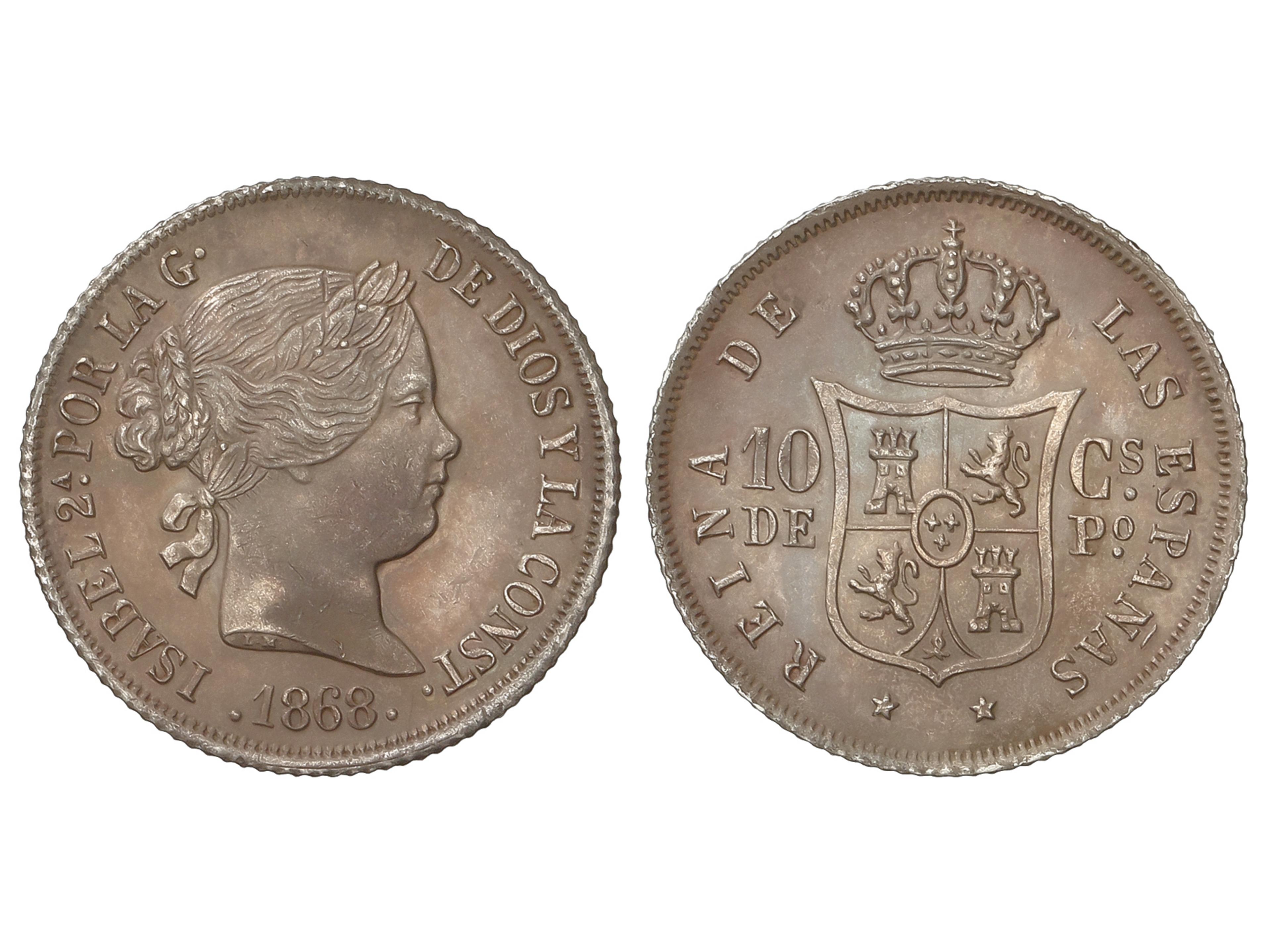 10 Centavos de Peso. 1868. MANILA. 2,57 grs. Ligera pátina. AC-656. EBC. (Image1)