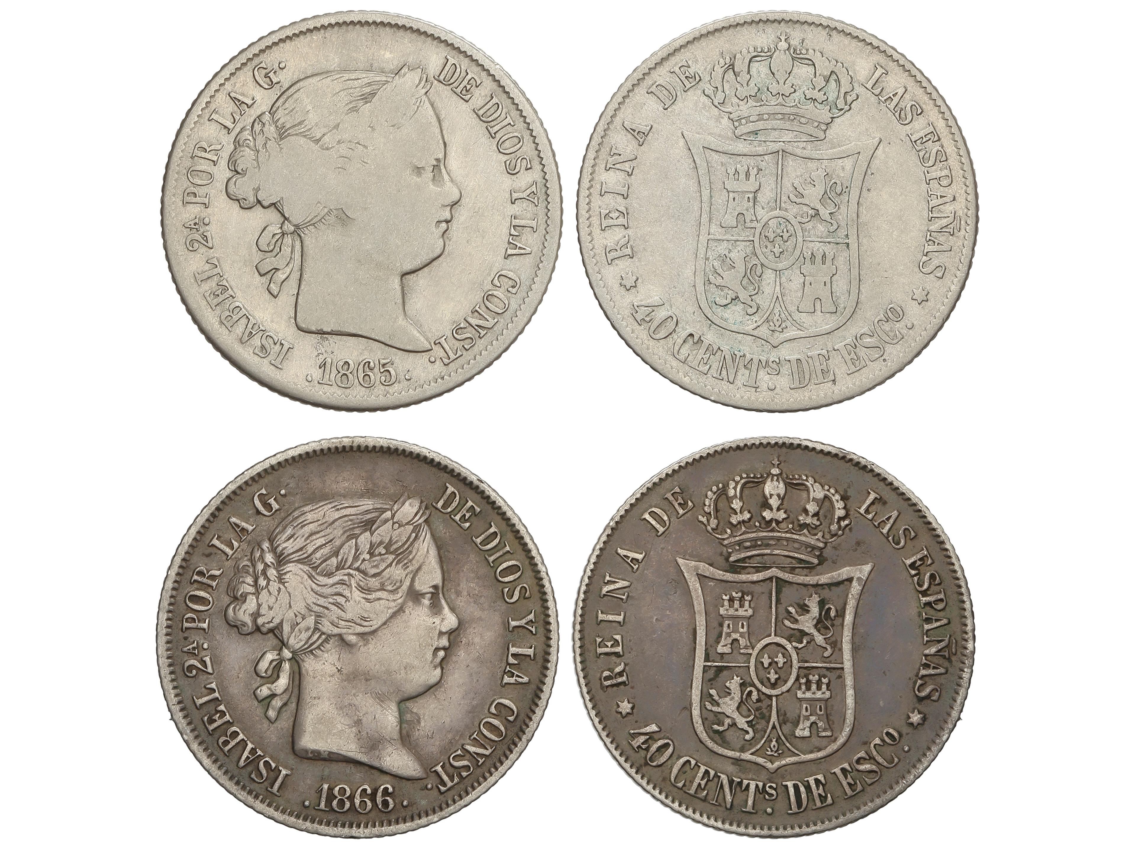 Lote 2 monedas 40 Céntimos de Escudo. 1865, 66. MADRID. 5,04 y 5,10 grs. A EXAMINAR. AC-500, 501. BC+ a MBC. (Image1)