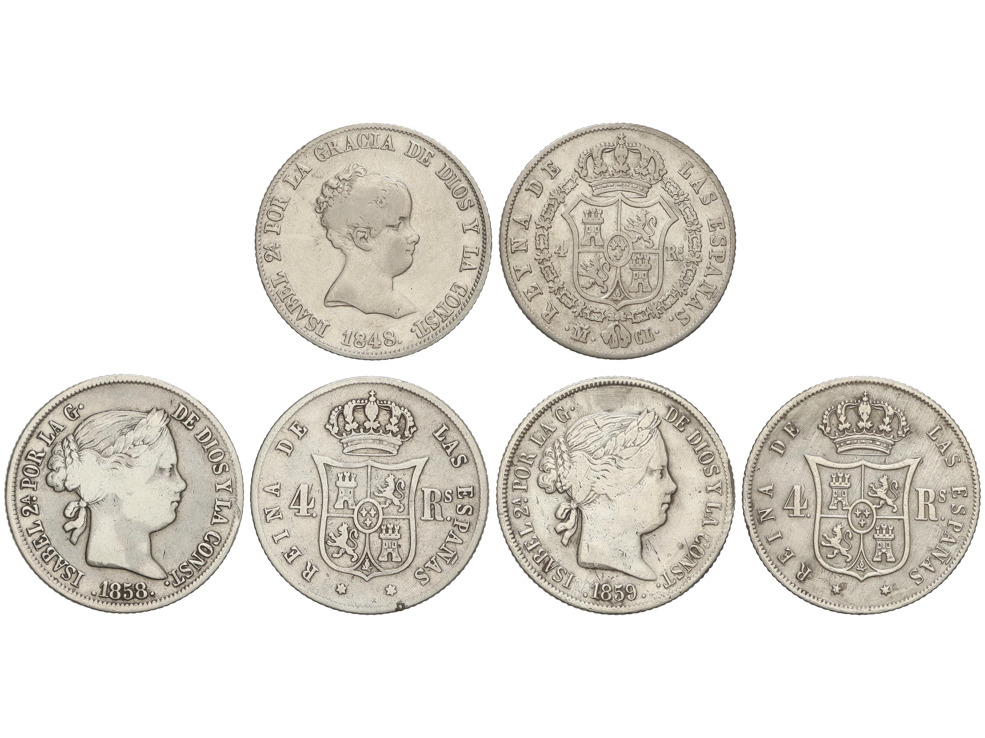 Lote 3 monedas 4 Reales. 1848, 58, 59. MADRID. A EXAMINAR. AC-453, 464, 465. BC+ a MBC-. (Image1)
