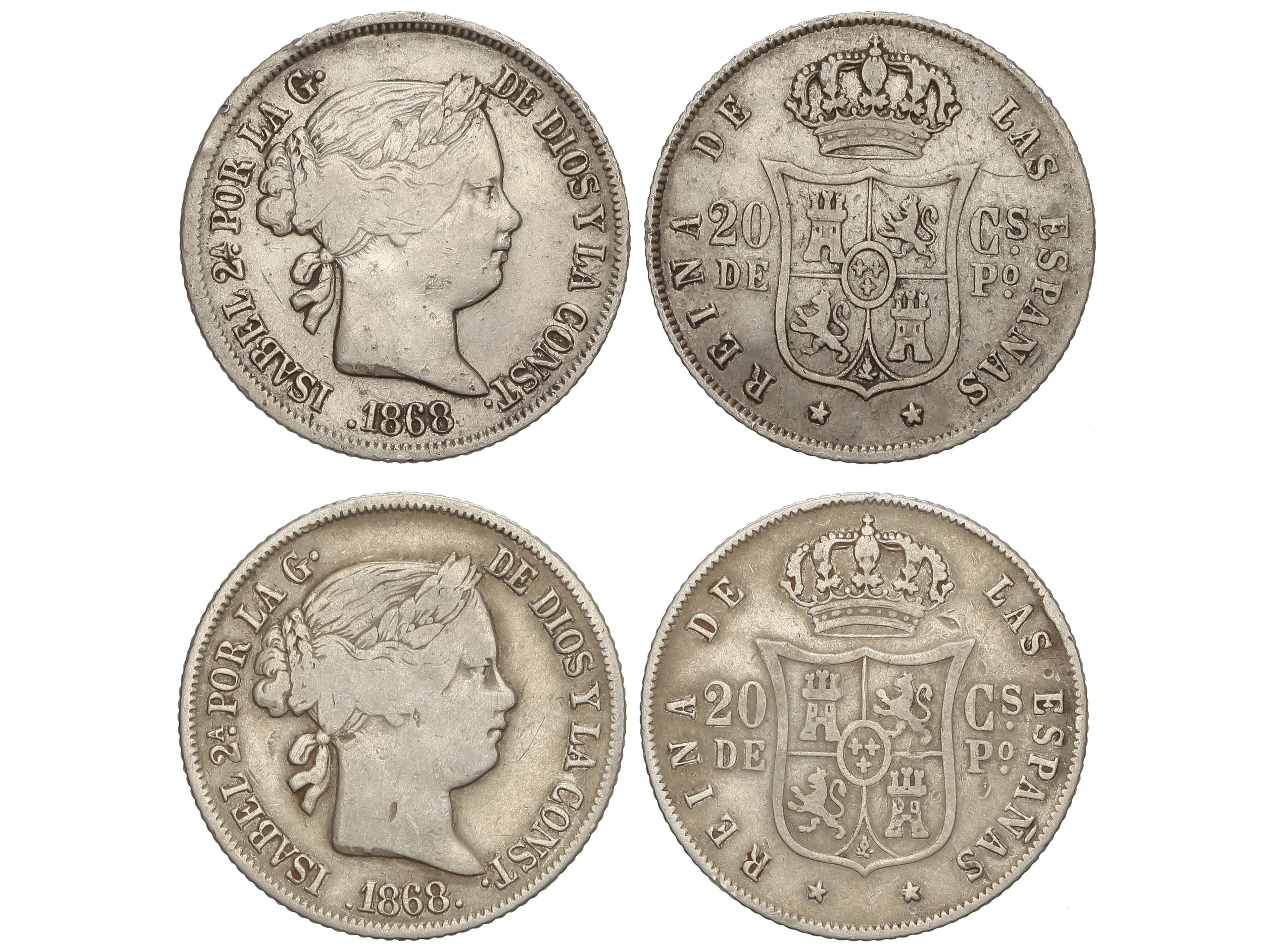 Lote 2 monedas 20 Centavos de Peso. 1868. MANILA. 5,04 y 5,06 grs. AC-661. MBC-. (Image1)