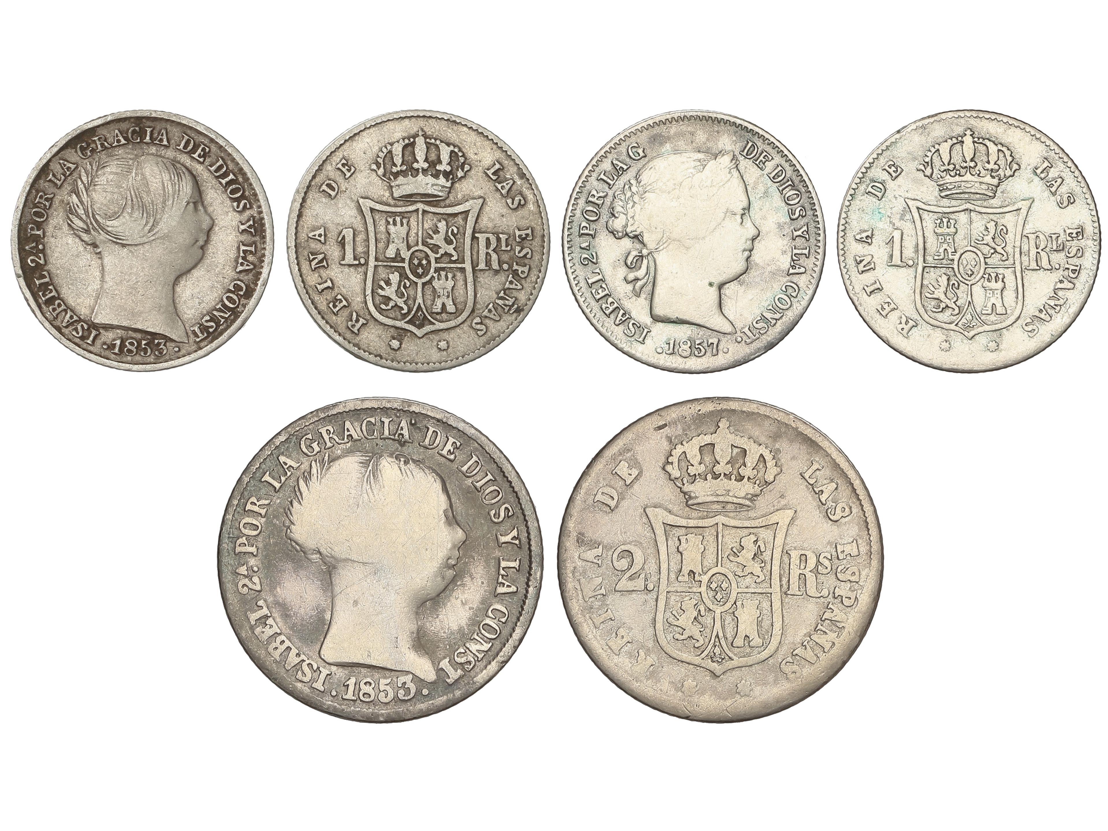 Lote 3 monedas 1(2) y 2 Reales. 1853 (2), 1857. SEVILLA. A EXAMINAR. AC-322, 326, 391. BC a MBC. (Image1)