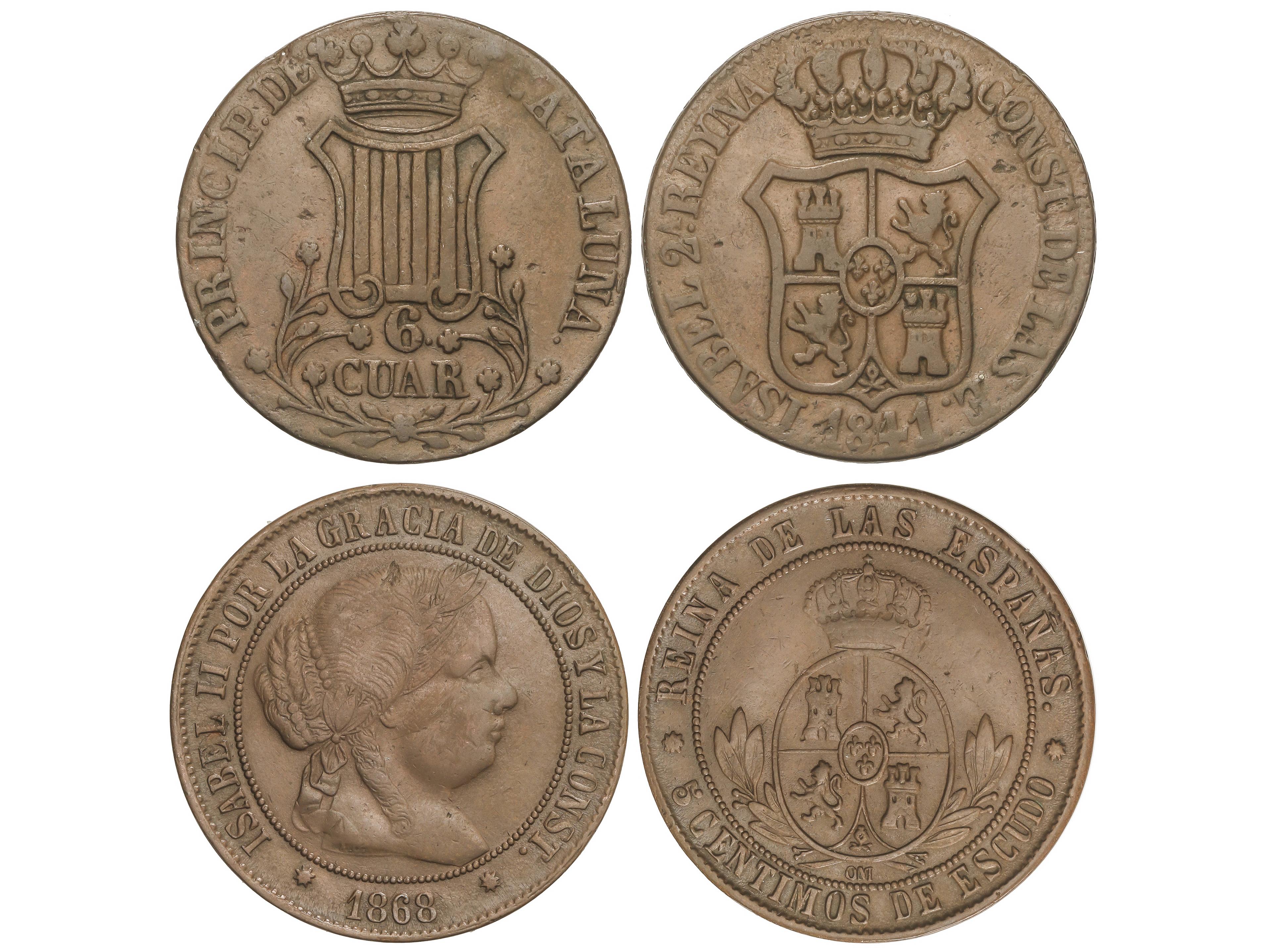 Lote 2 monedas 6 Cuartos y 5 Céntimos de Escudo. 1841, 1868. BARCELONA. 12,52 y 14,26 grs. AC-22, 246. MBC. (Image1)