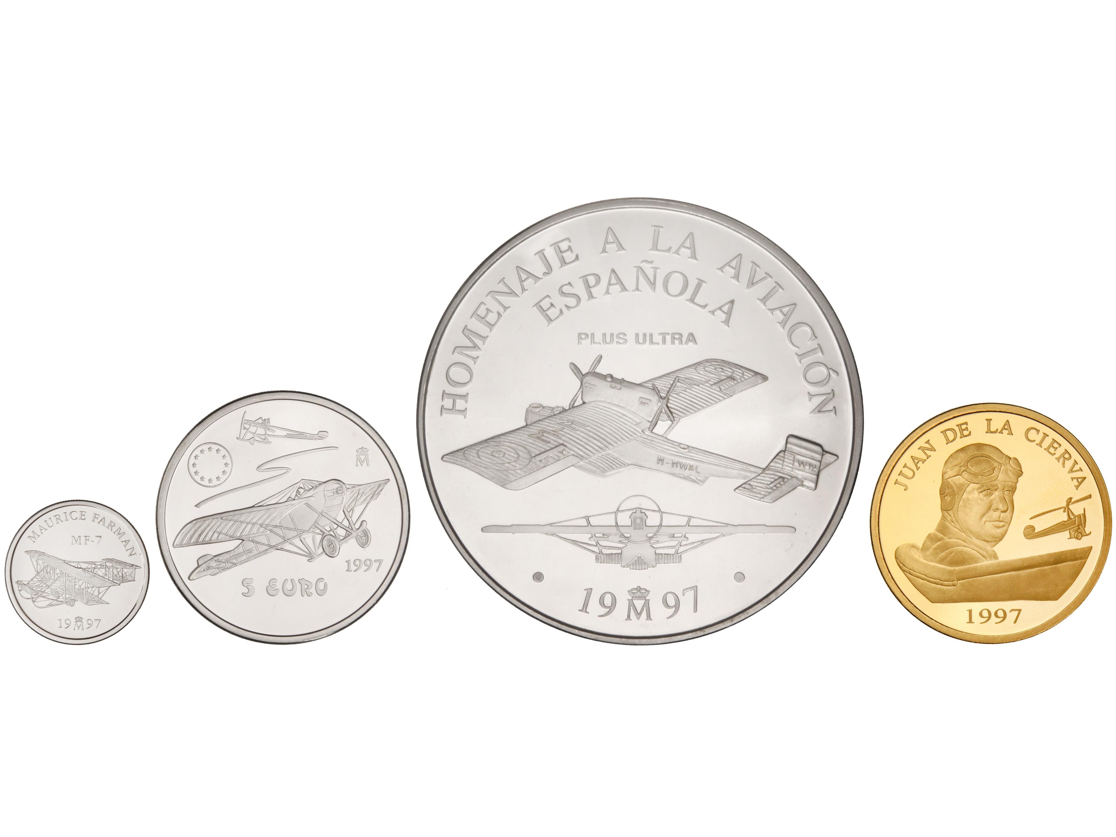2294 imageLote 4 monedas 1, 5, 25 y 200 Euro. 1997. AR (3) y AU. Serie completa Homenaje a la Aviación Española. En estuche original con certificados. FDC. (Image1)