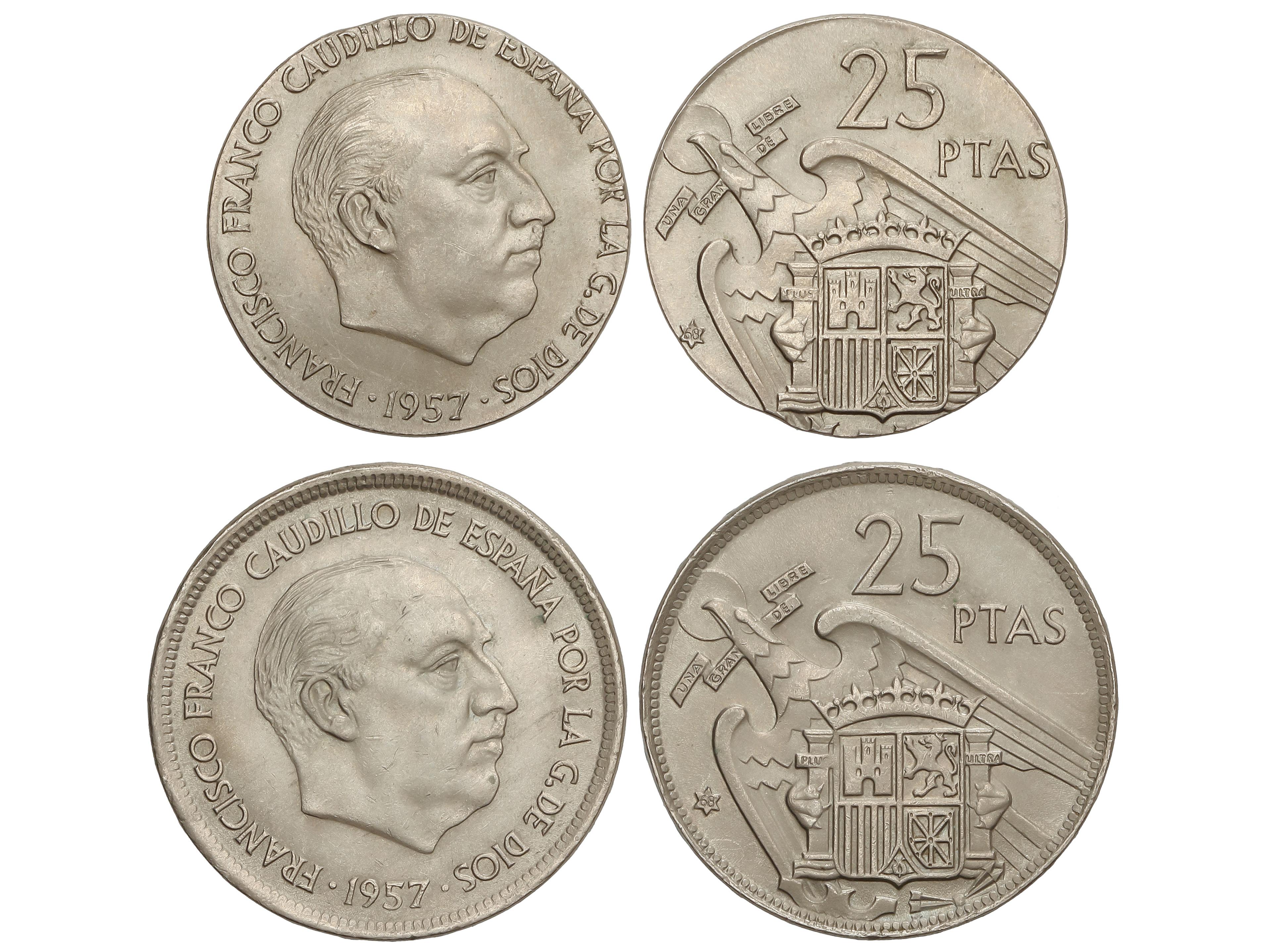 2283 imageLote 2 monedas 25 Pesetas. 1957 (*68). Una con ERROR, acuñada sobre un cospel de 5 Pesetas. Canto liso sin leyenda (5,69 grs). Incluye moneda sin error para comparar (8,86 grs). EBC a EBC+. (Image1)