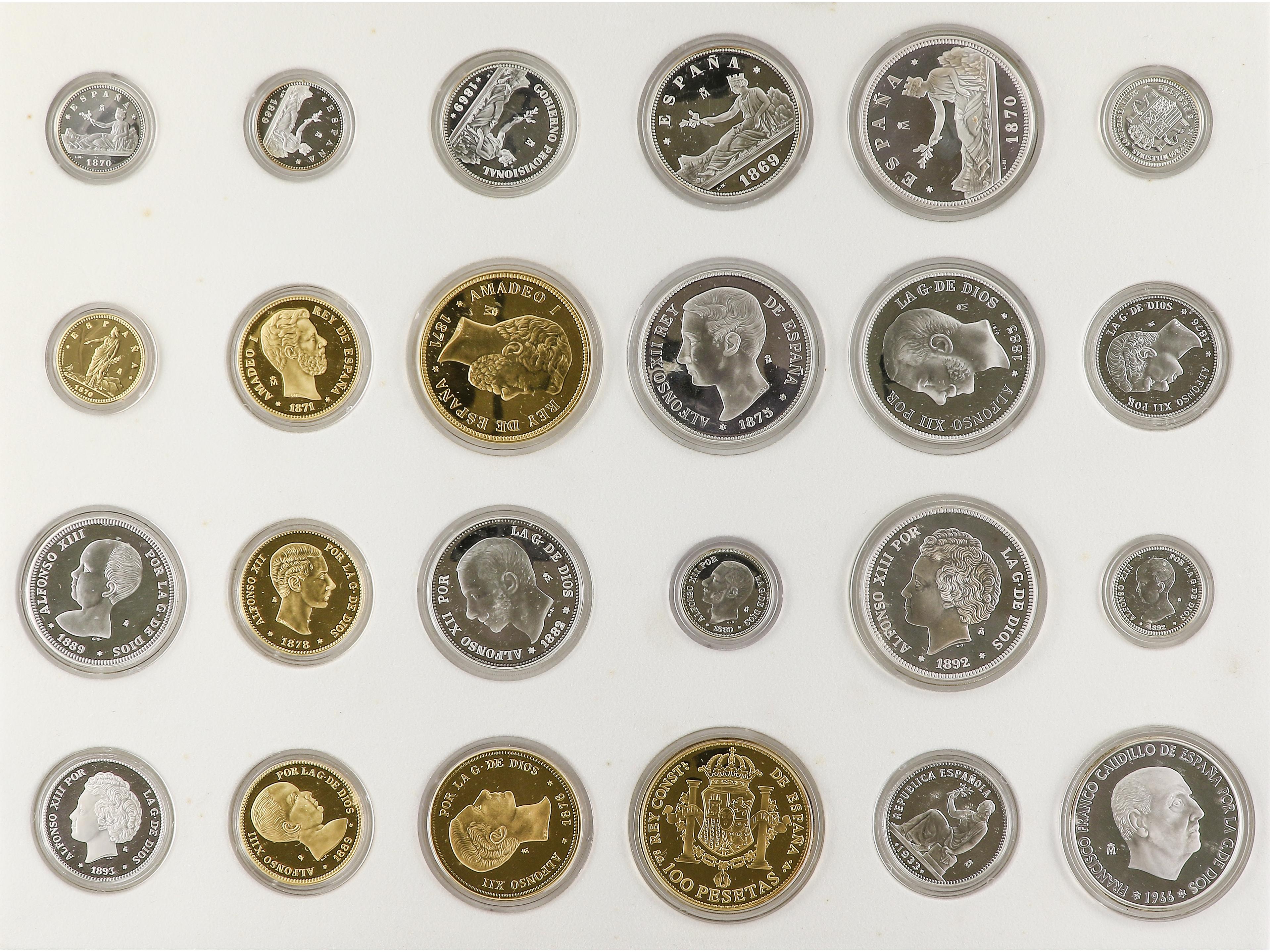 2292 imageEmisión especial conmemorativa de réplicas de las 24 monedas de plata y oro que forman la Historia de la Peseta. Peso aproximado total 550 grs. AR y AR dorada. En estuche original F.N.M.T. con certificado. FDC. (Image1)