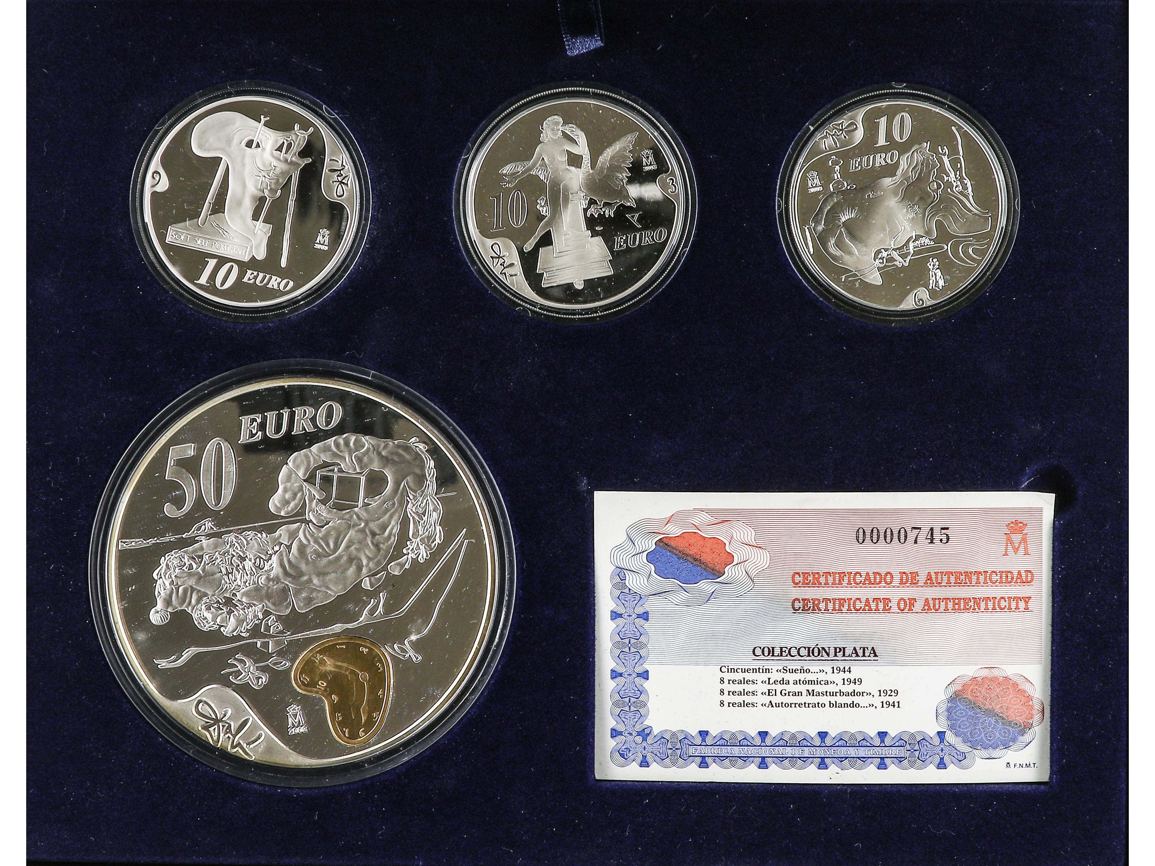 2293 imageSerie 4 monedas 10 (3) y 50 Euros. 2004. CENTENARIO DEL NACIMIENTO DE SALVADOR DALÍ. AR. Leda atómica, el Gran Masturbado, Autoretrato blando con Bacon frito y Centenario Nacimiento Salvador Dalí. En estuche original (Serie Plata), con certificado. PROOF. (Image1)