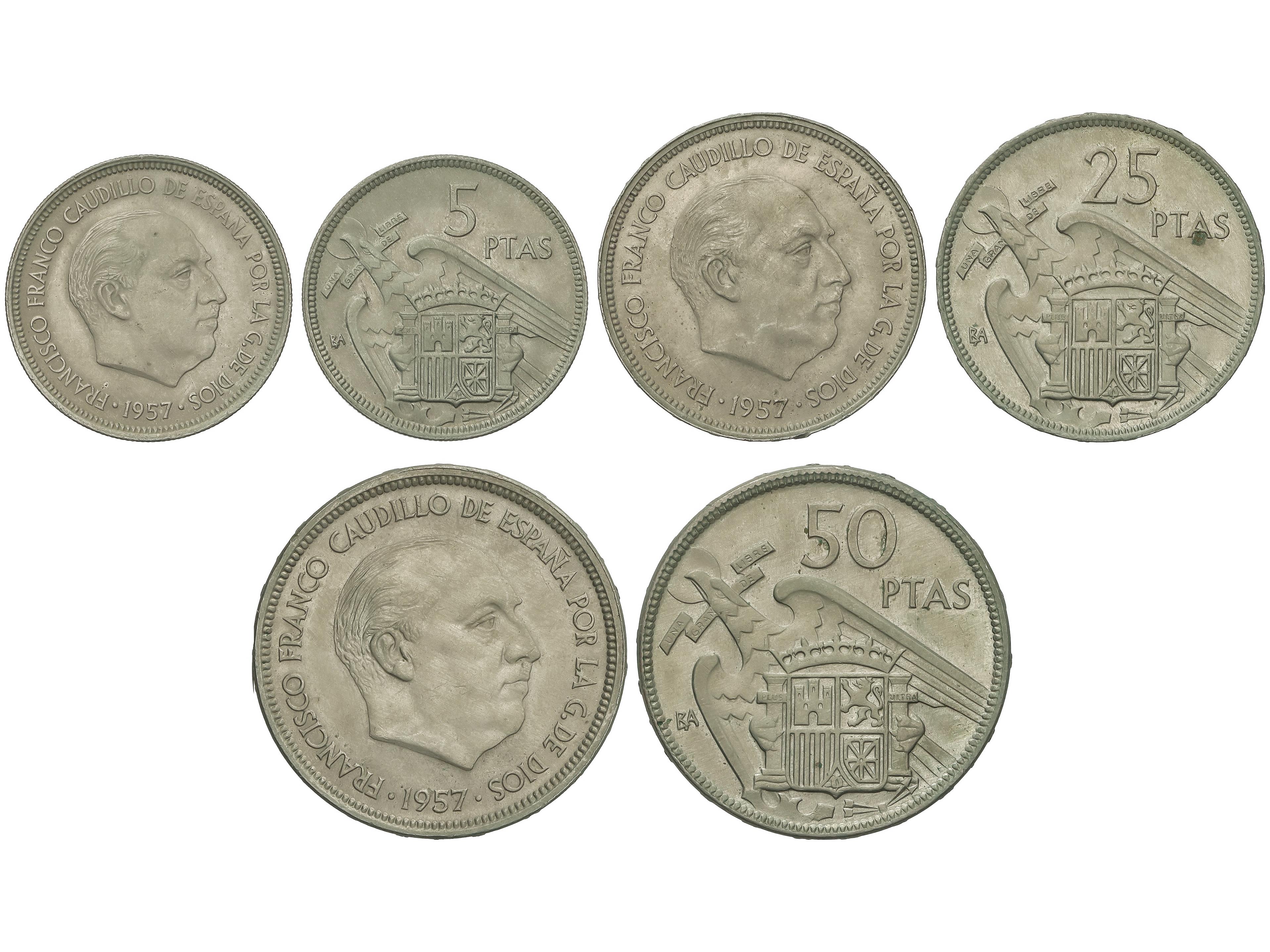 2285 imageSerie 3 monedas 5, 25 y 50 Pesetas. 1957 (*BA). I Exposición Iberoamericana Numismática y Medallística. Barcelona. EBC- a EBC+. (Image1)