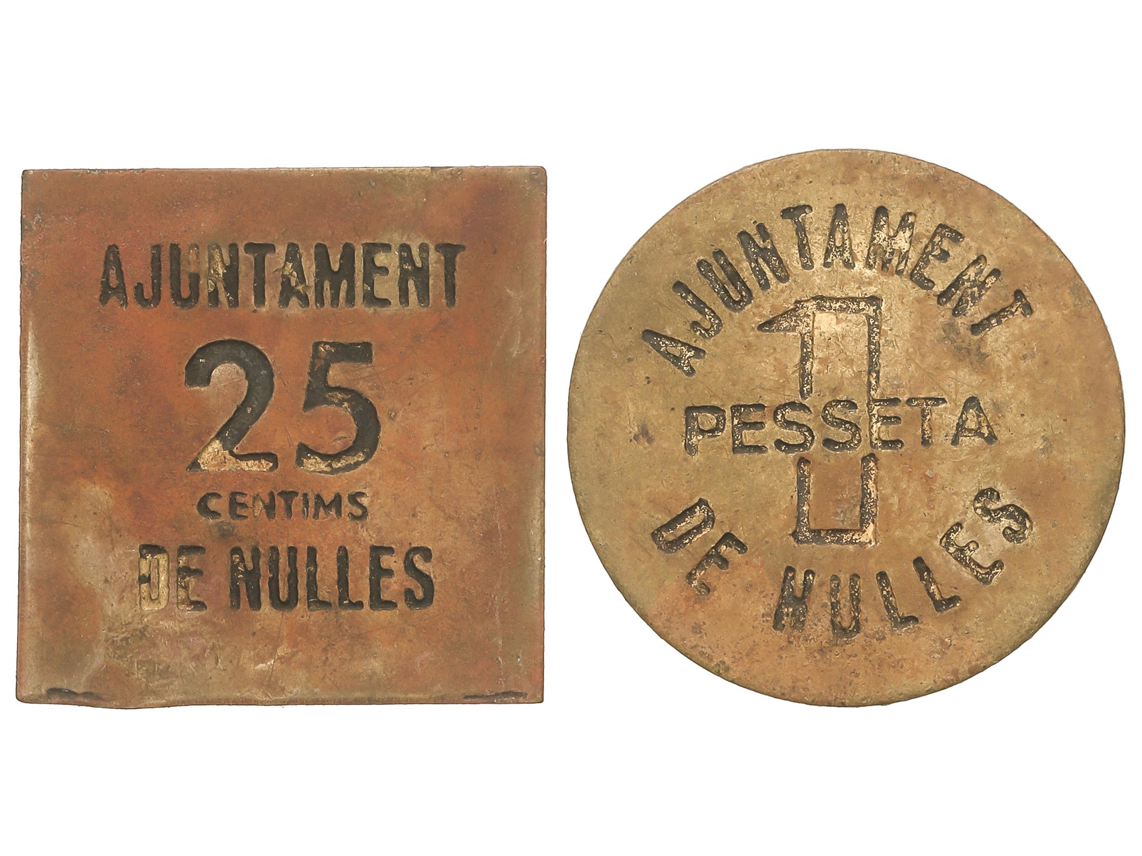 2277 imageLote 2 monedas 25 Cèntims y 1 Pesseta. Aj. de NULLES. Latón. RARAS. HG-222, 224; Vti-L30, L32. MBC+. (Image1)