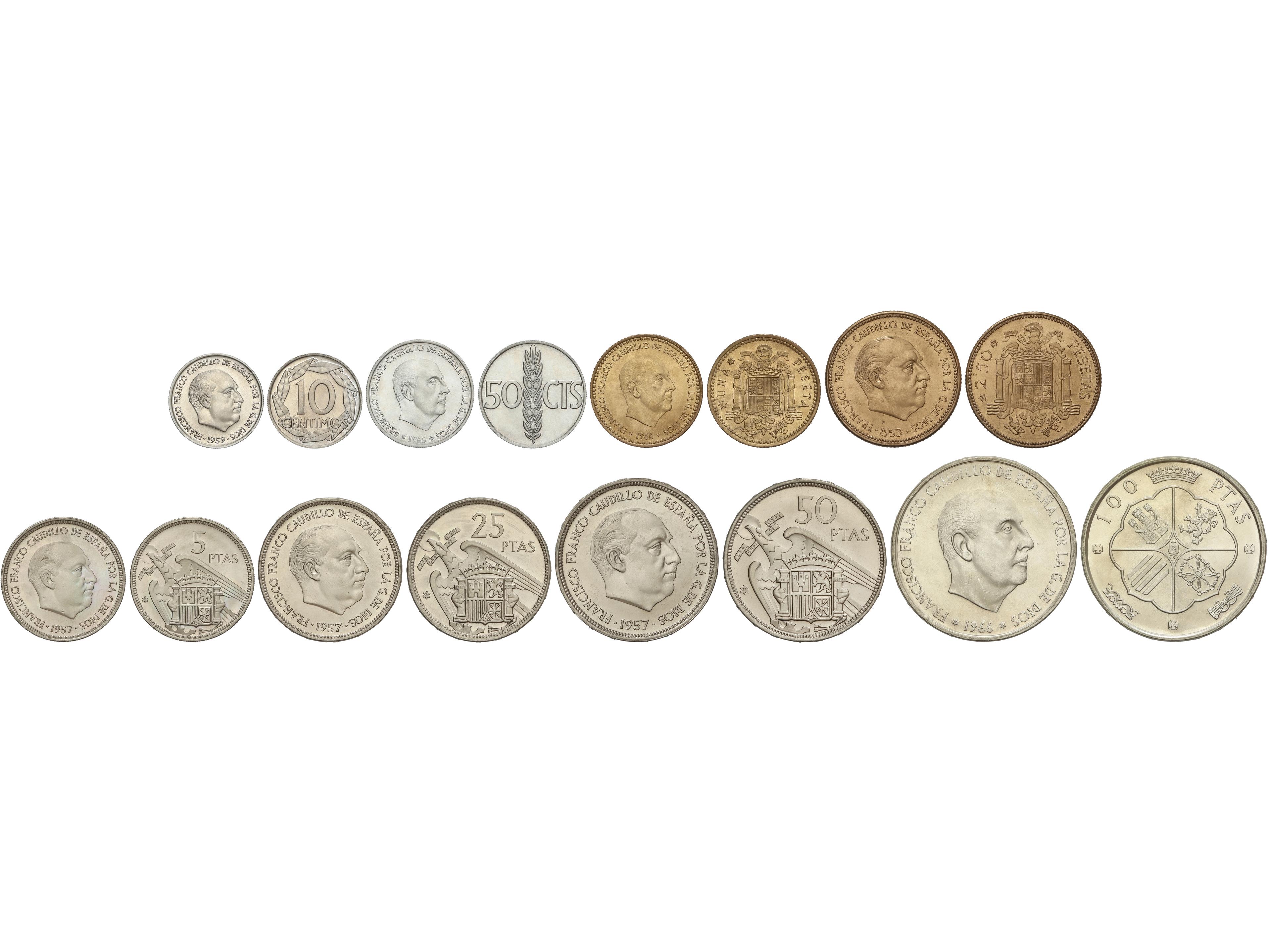 2284 imageSerie 8 monedas 10 Céntimos a 100 Pesetas. (*71). En tira original F.N.M.T. La de 100 Pesetas (*19-70). PRUEBAS. (Image1)